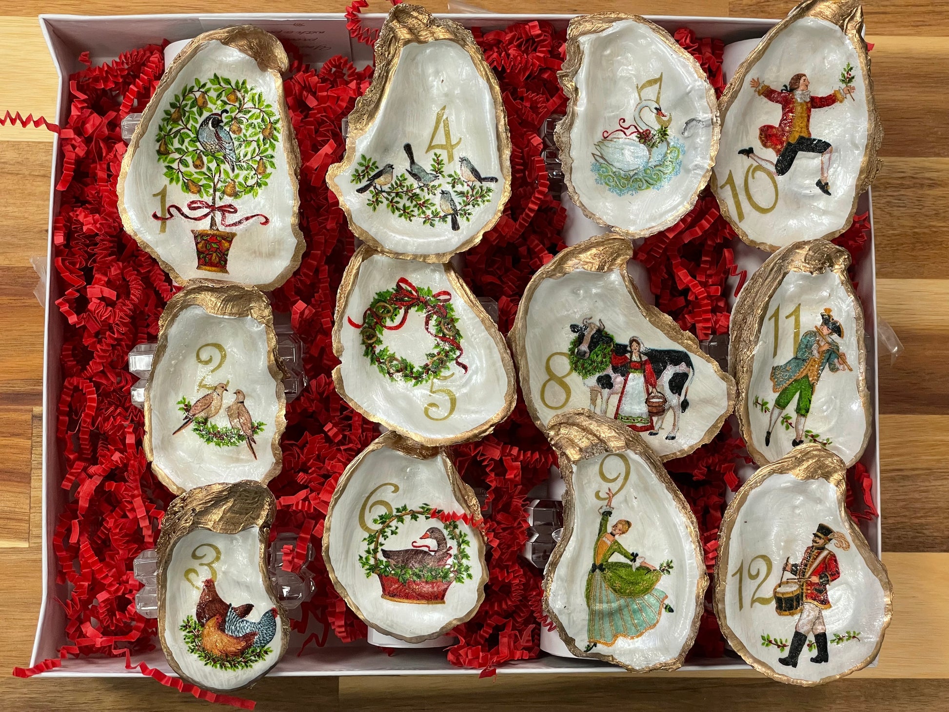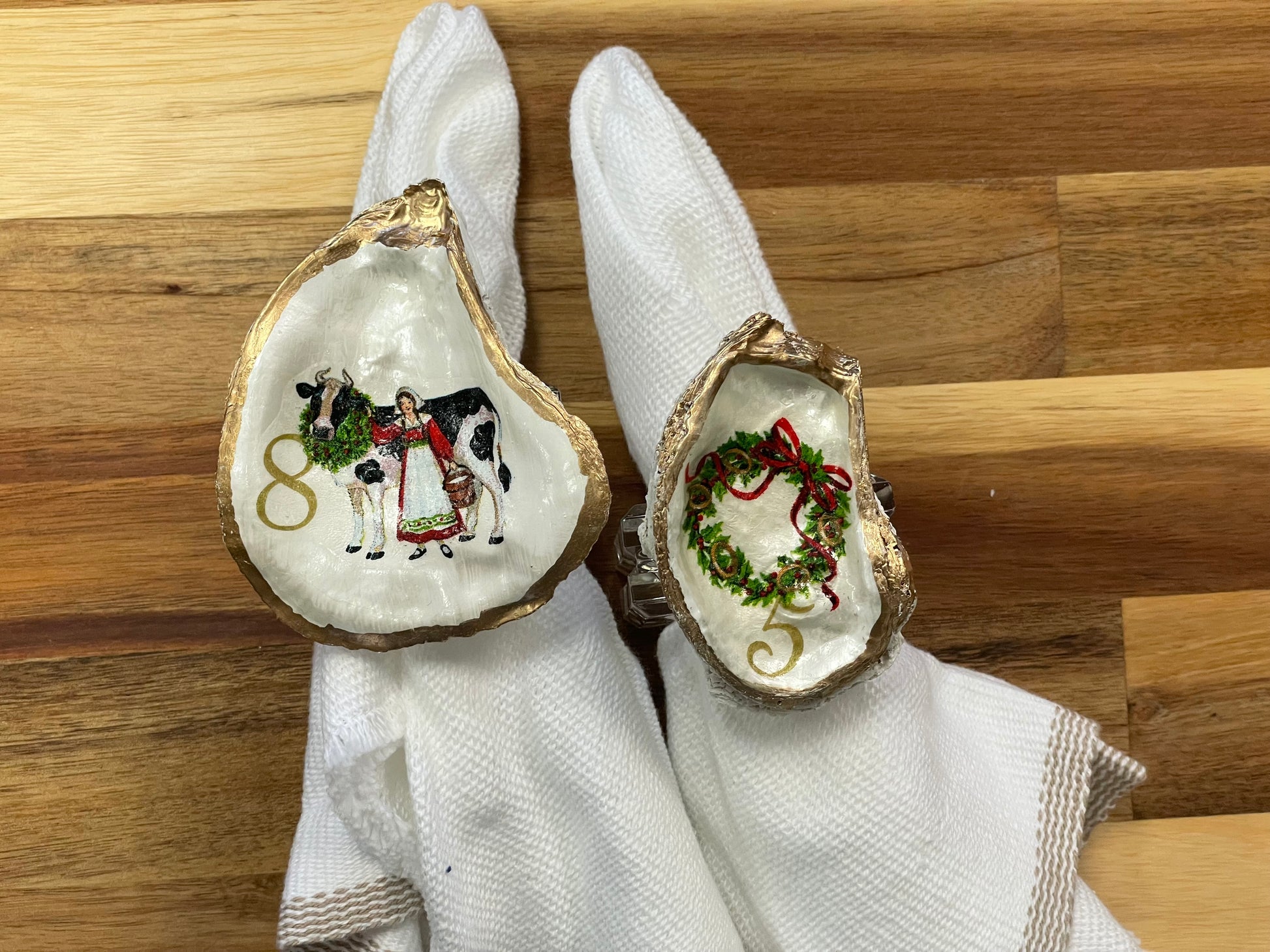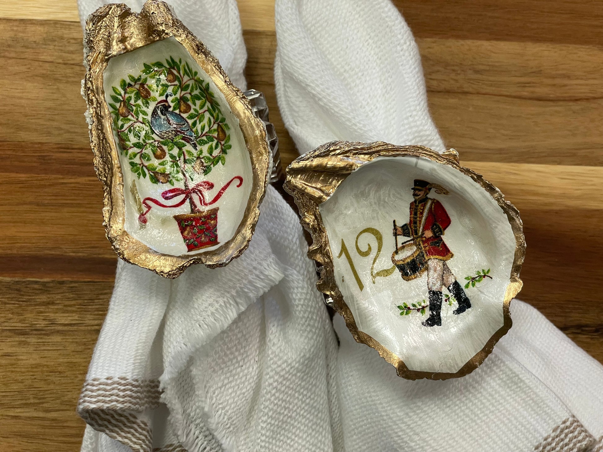 Product Detail: Beautiful oyster shells decoupaged and painted with the 12 days of Christmas that sit on an acrylic napkin ring. The shells are picked in Rockport, Texas where the group attends camp every summer. Each shell is unique in its size and shape. These are the perfect addition to your Christmas place setting!