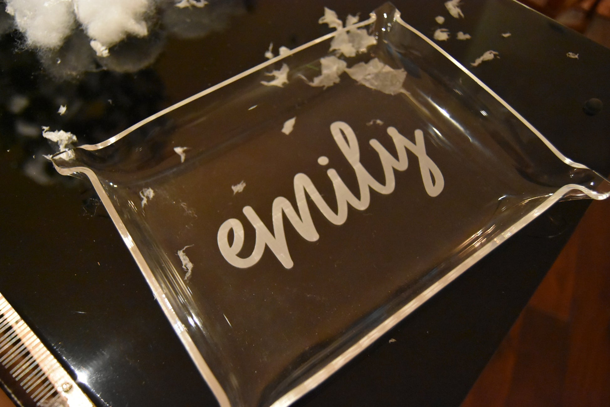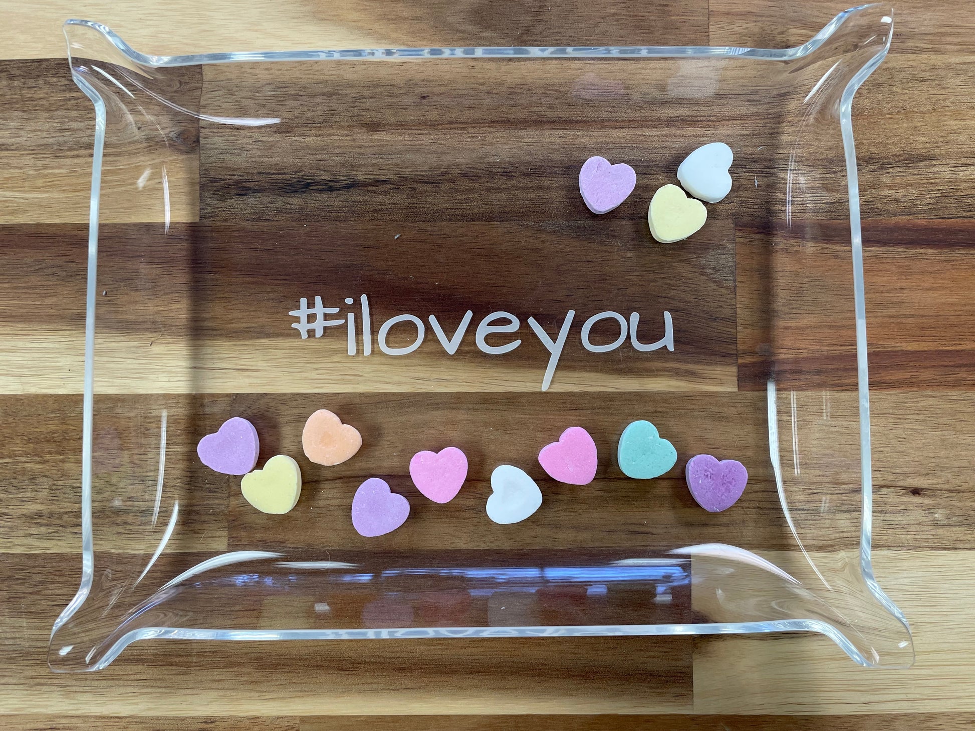Product Details: Laser etched acrylic catch-all. 6" x 8"