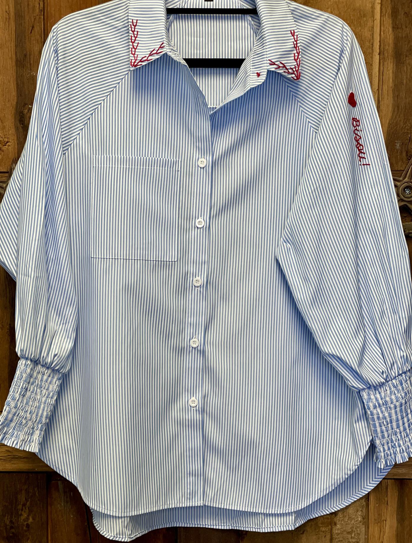 Upgrade your wardrobe with this stylish blue and white button down. Featuring an oversized, striped boyfriend fit, this casual long sleeve shirt is hand embroidered on the collar and sleeve for a unique touch. Made of a comfortable blend of 65% polyester and 34% cotton, this button down is both fashionable and comfortable.