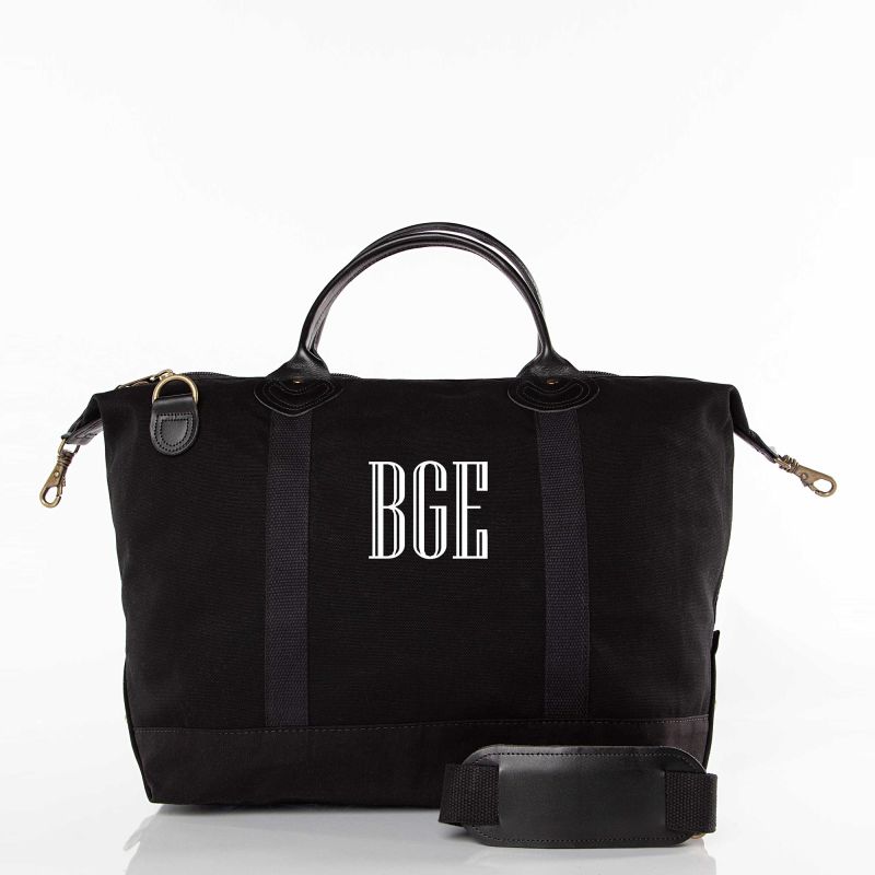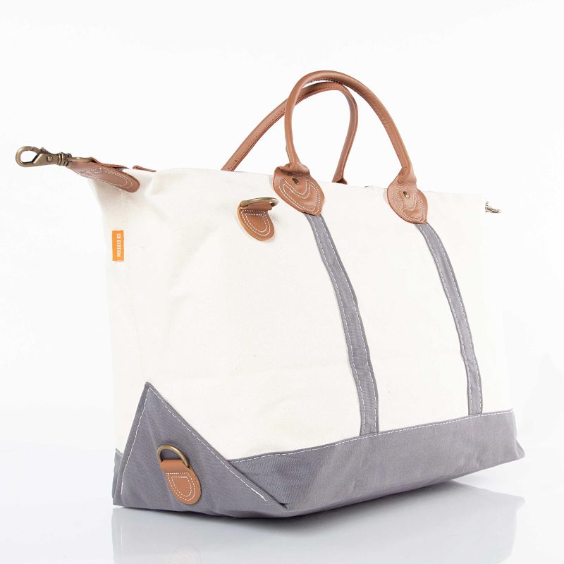 Product Details: Whether you're off on business, visiting family and friends for the weekend, or headed off to college in need of a large accommodating duffel, the Weekender is your go-to travel bag. In addition to ample storage space, this popular weekend getaway duffel features a top zip closure, inside zip pocket and two standard wallet sized pockets. Equipped with two genuine leather handles and a detachable shoulder strap, It's sure to keep you traveling in style comfortably. This canvas body bag features a contrasting trim, leather accents, and antique brass hardware 18 ounce canvas. Measures 15" H x 28" W x 105" D. Embroidered in style and color of your choice.