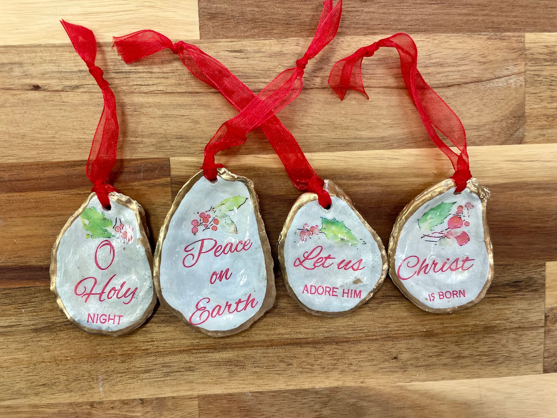 Set of four oyster shell ornaments painted and decoupaged with holiday tidings! The shells are picked in Rockport, Texas where the artisans attend camp every summer. Each shell is unique in its size and shape and hangs from a coordinating ribbon.