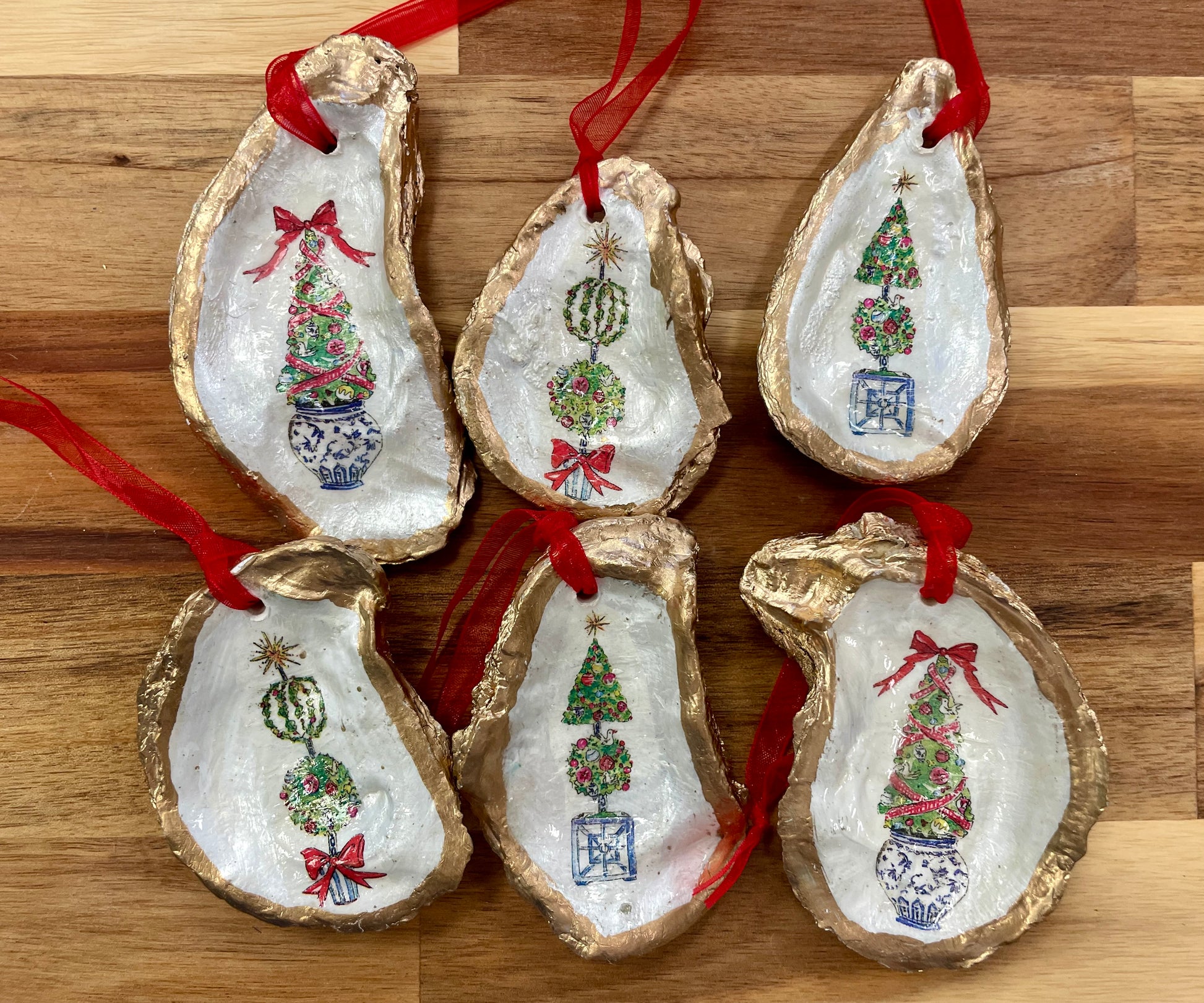 Set of six beautiful oyster shell ornaments decoupaged and painted with topiary Christmas trees. The shells are picked in Rockport, Texas where the group attends camp every summer. Each shell is unique in its size and shape, and hangs from a coordinating ribbon.