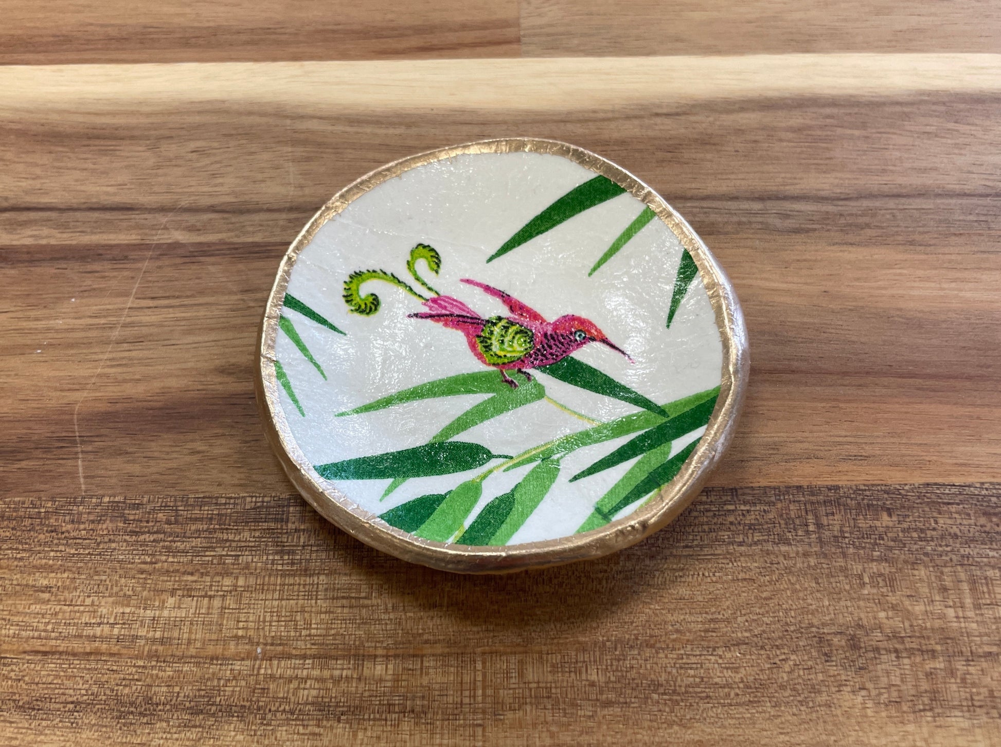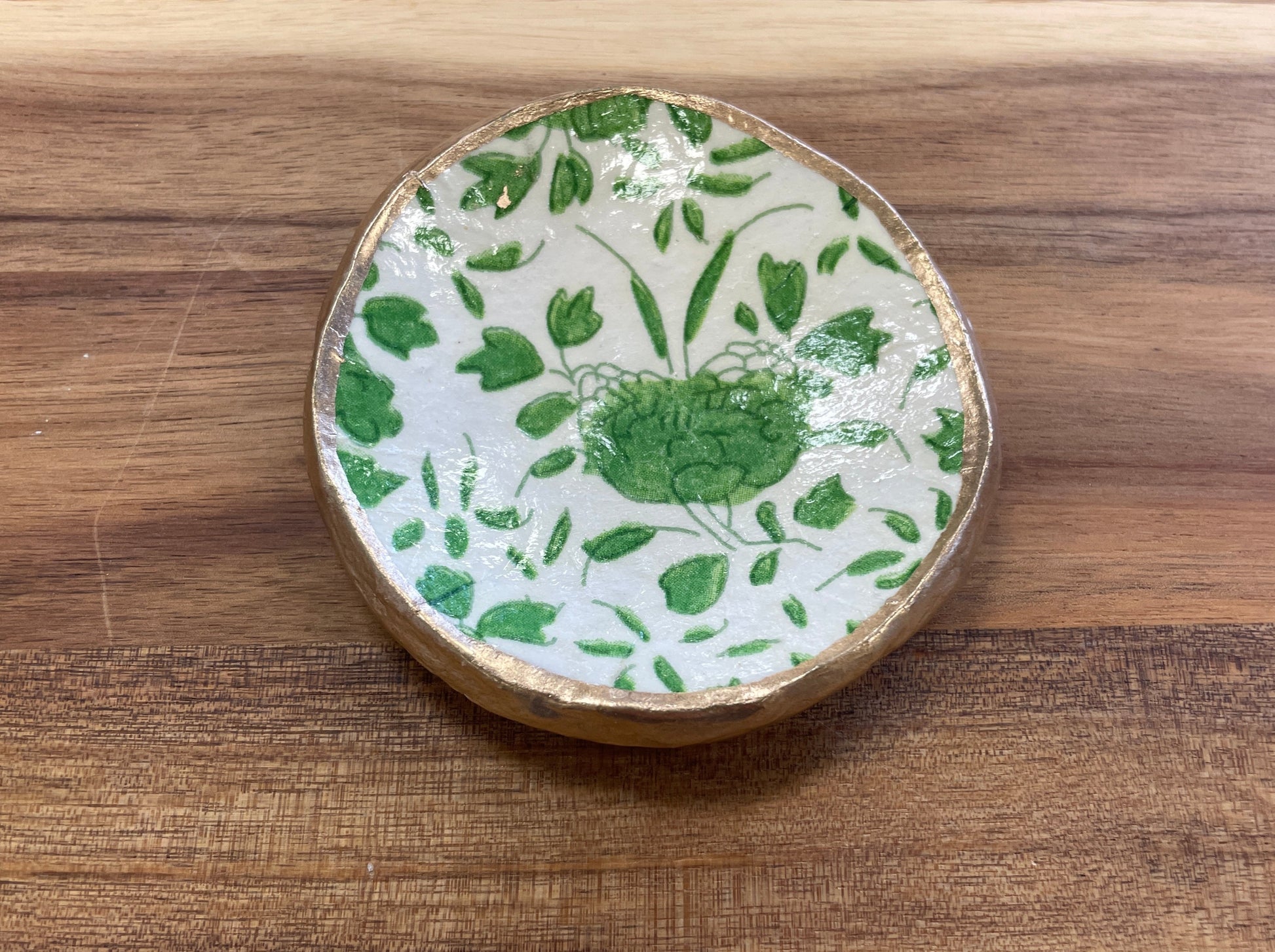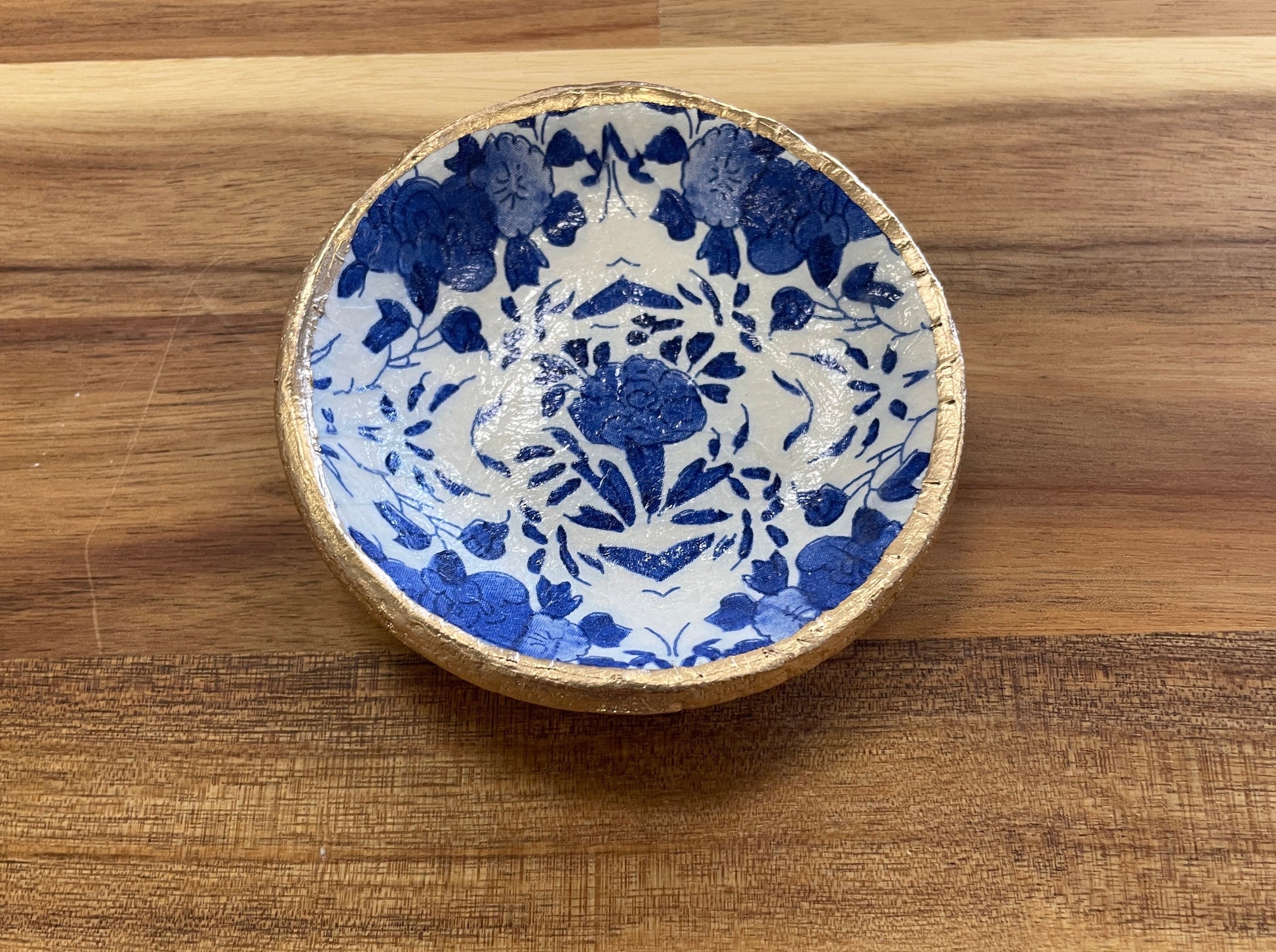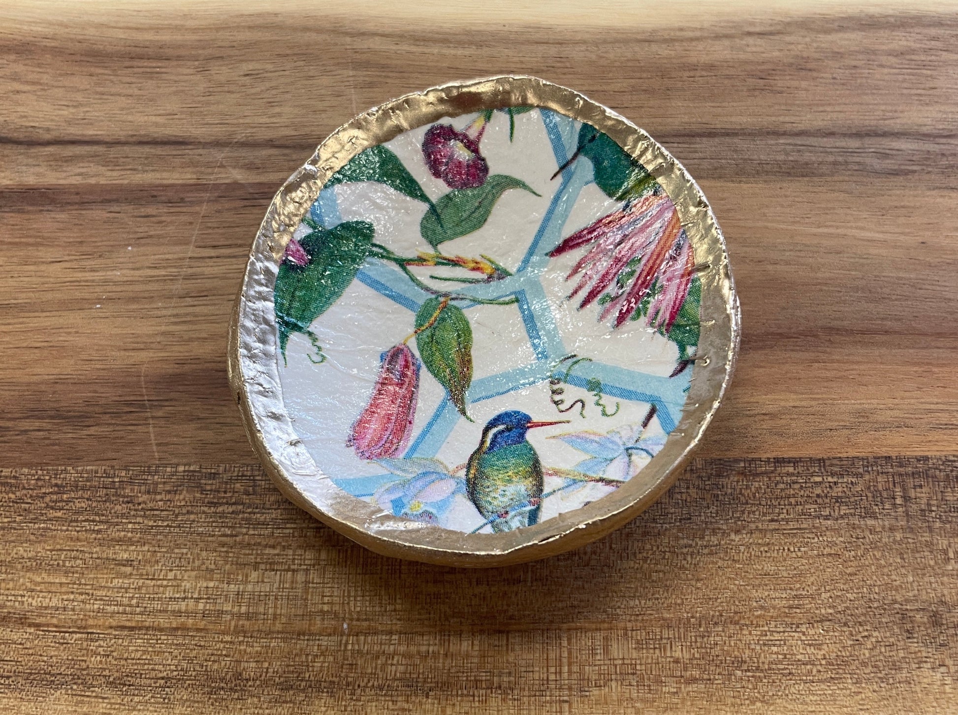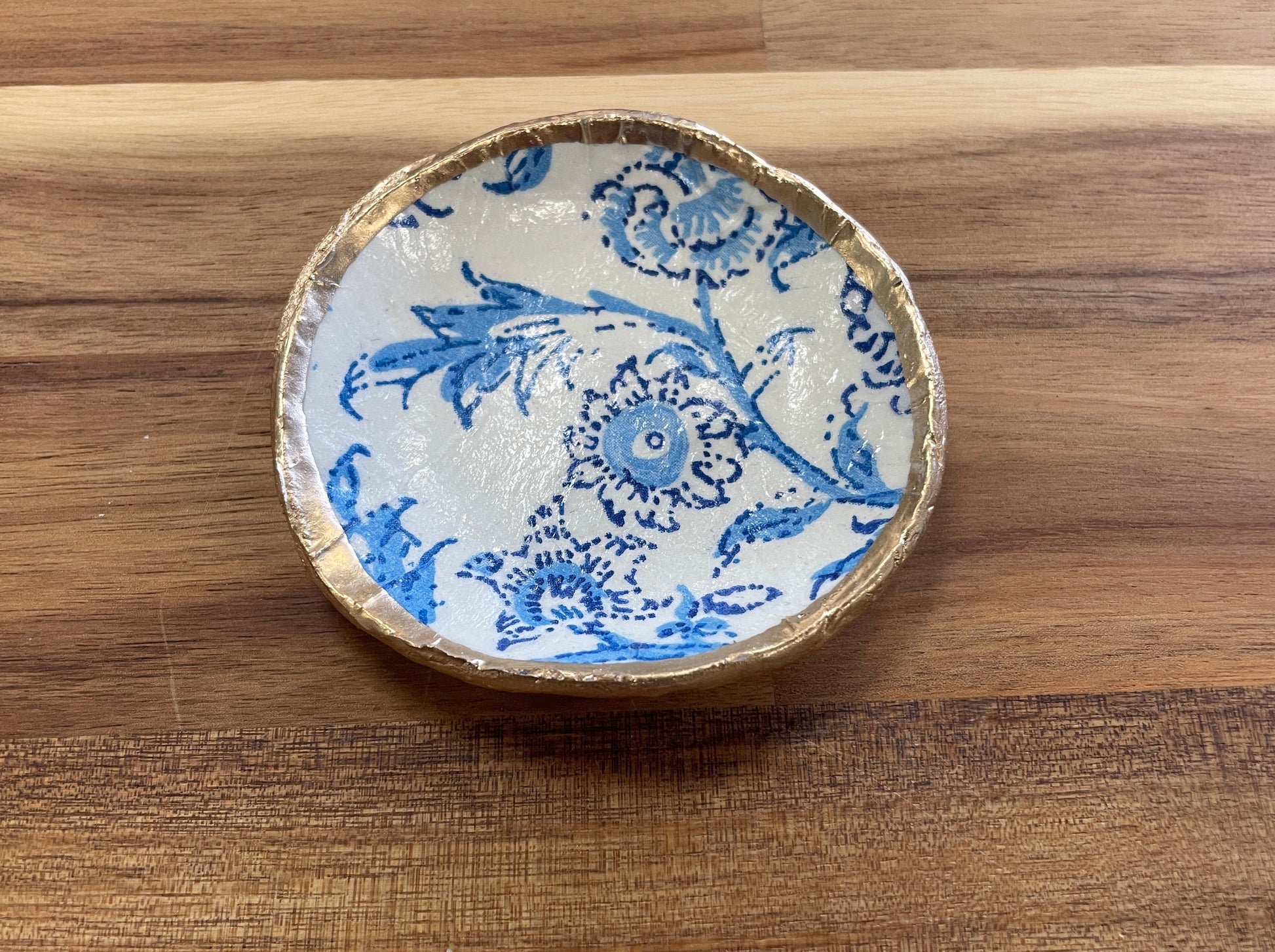 Handcrafted from clay, these ring dishes feature a decoupaged design and hand-painted gold trim. Dishes measure between 3"- 4" (sizing varies slightly due to the handmade nature of the product).
