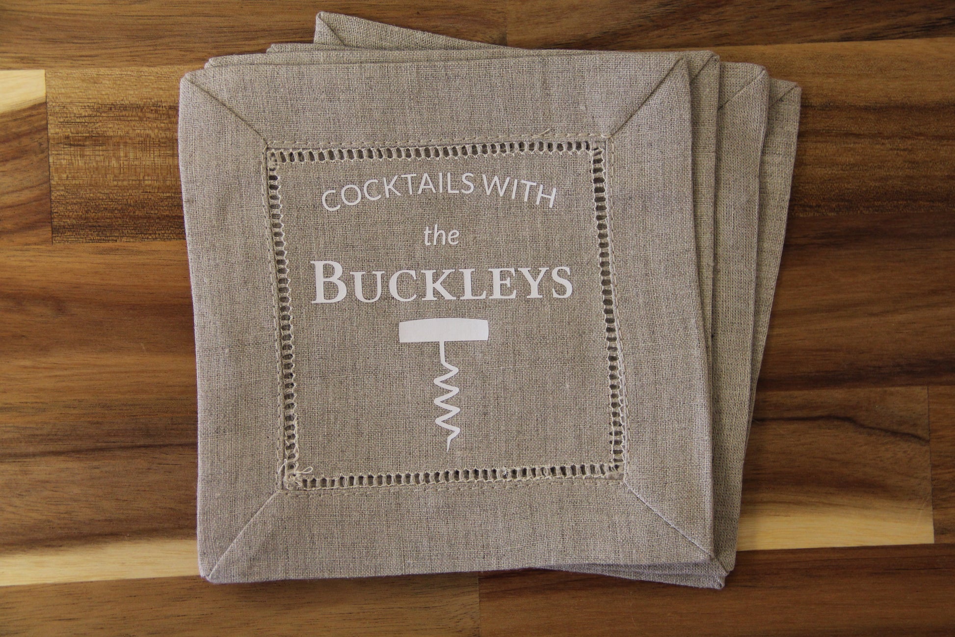Product Details: Set of 4 linen cocktail napkins, customized with monogram.
