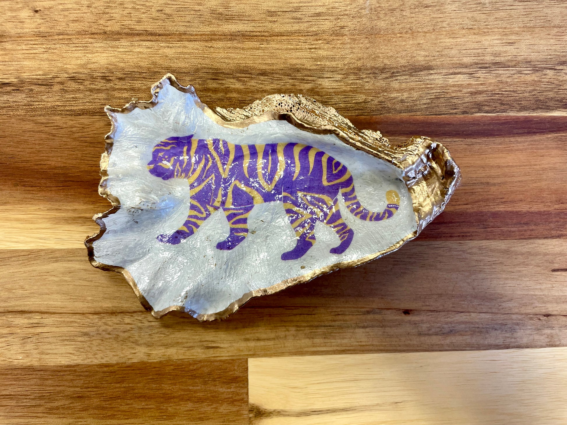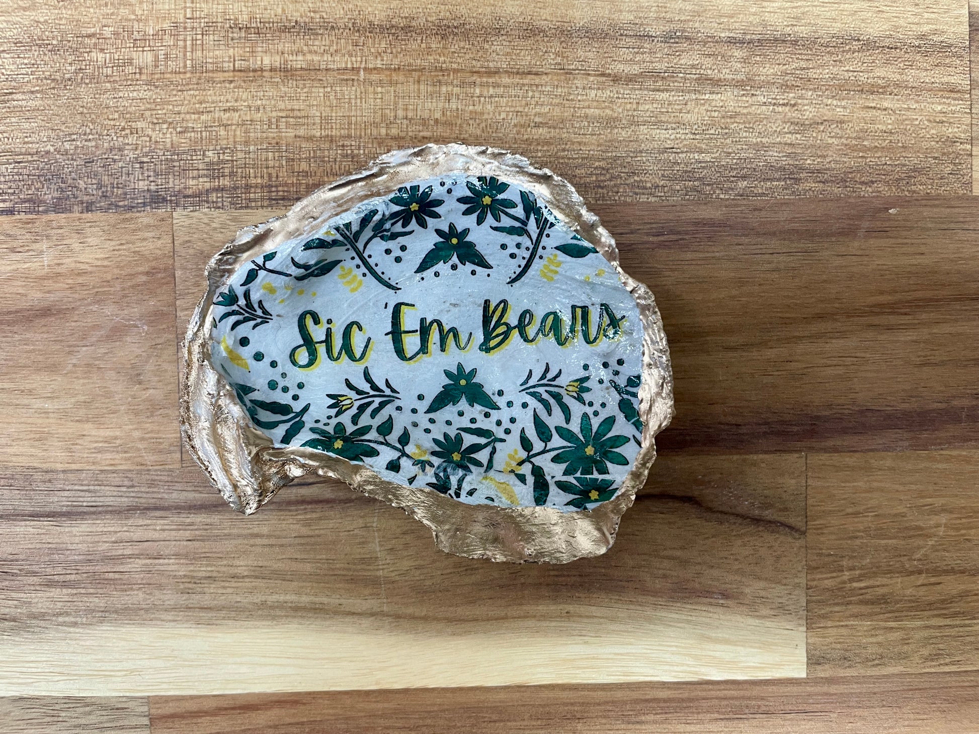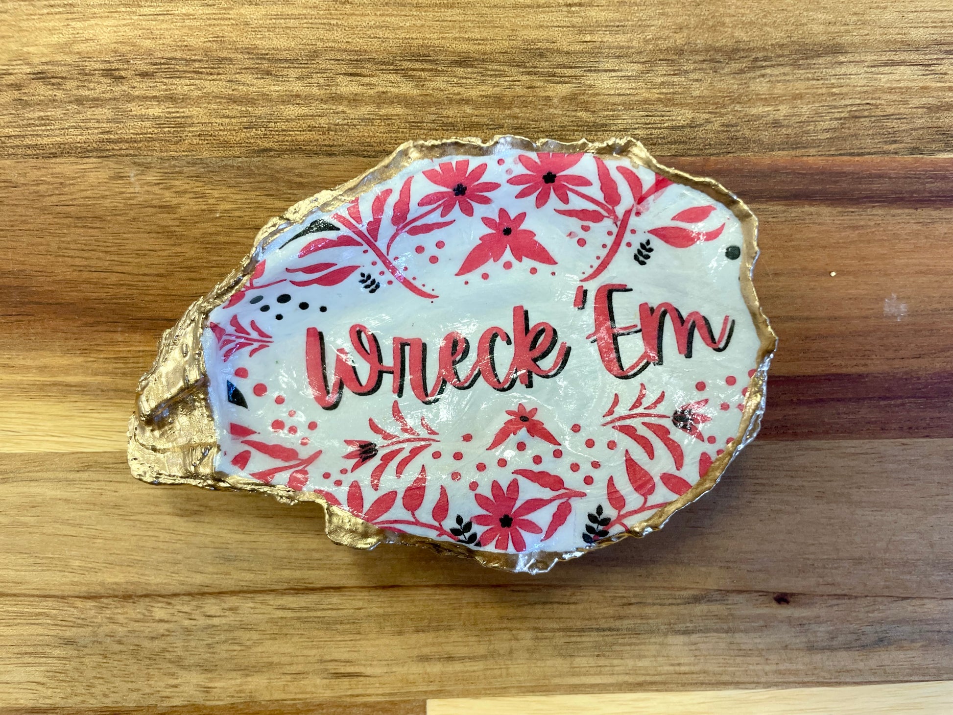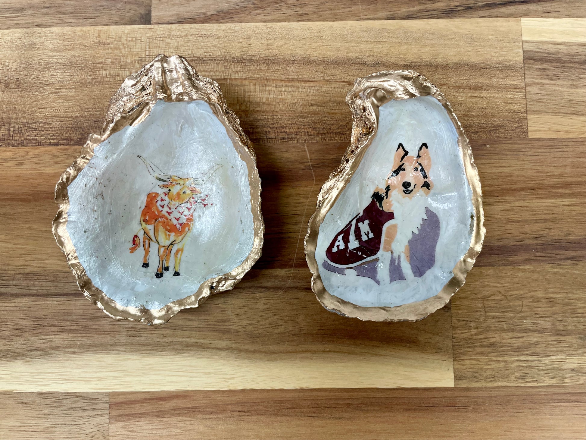 Oyster shells harvested from Rockport, Texas are decoupaged and hand painted with gold trim for a beautiful ring dish to show your school spirit!