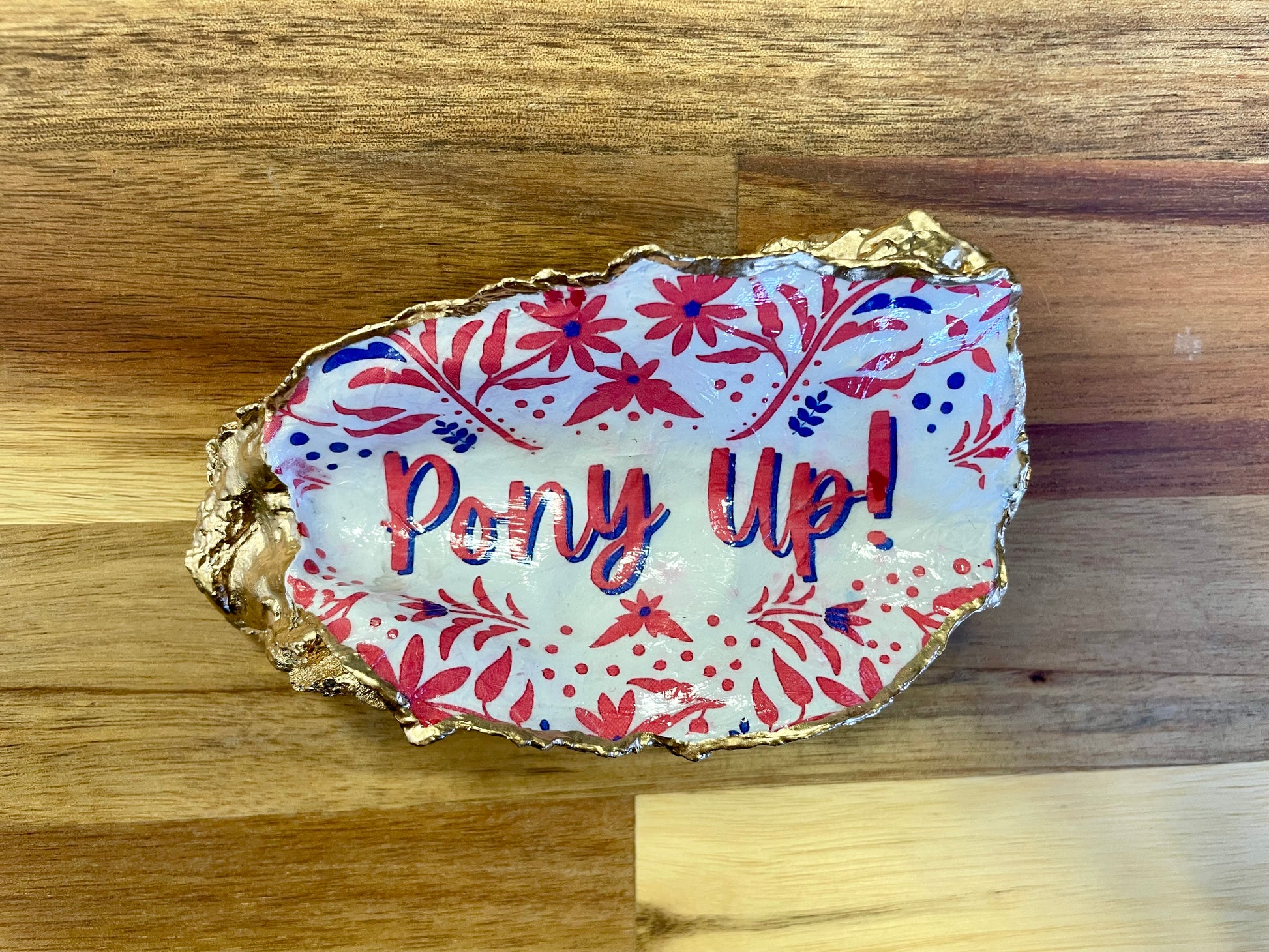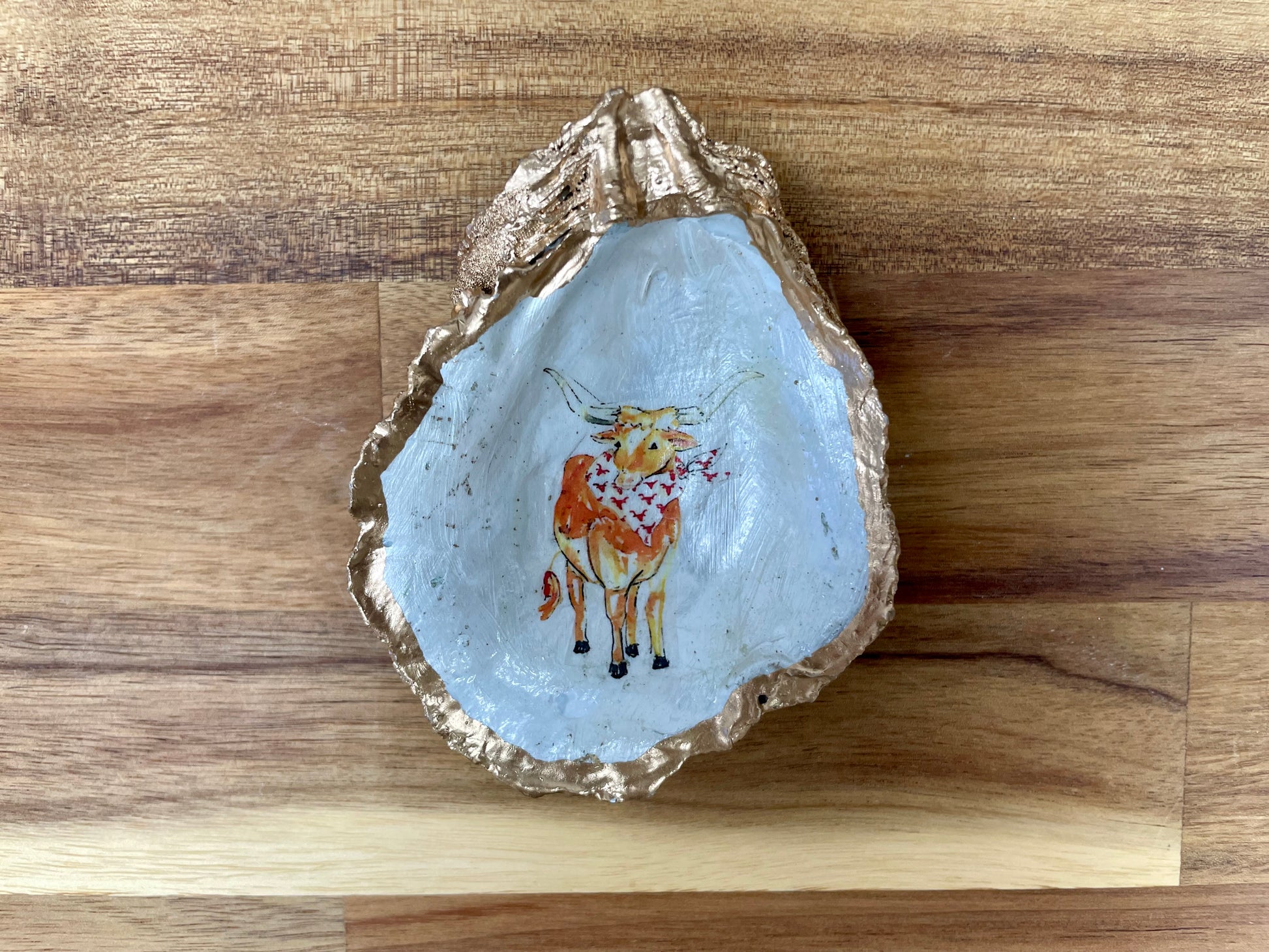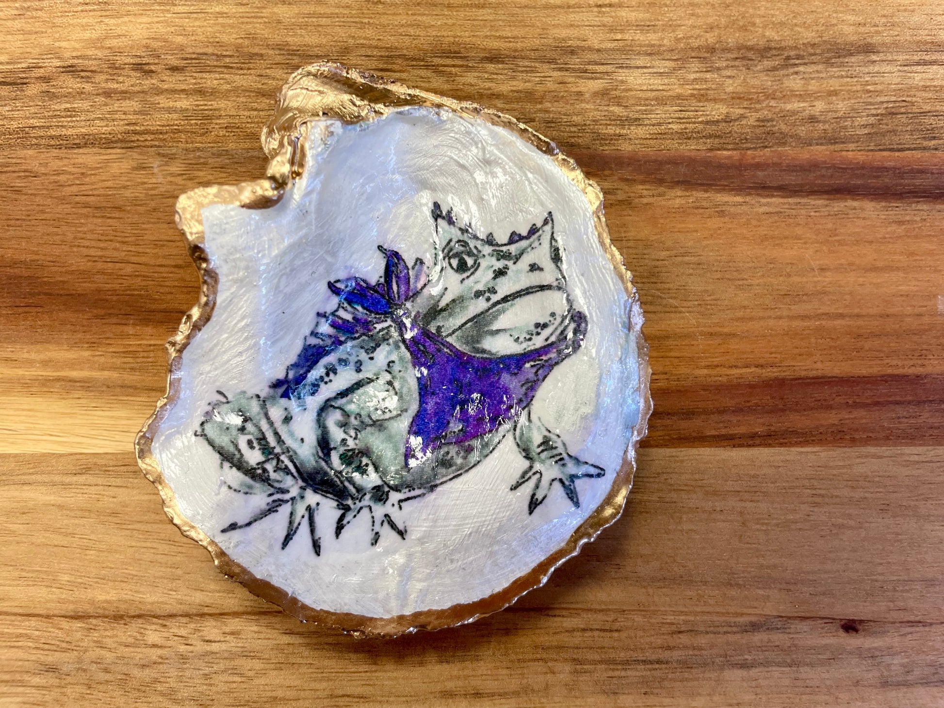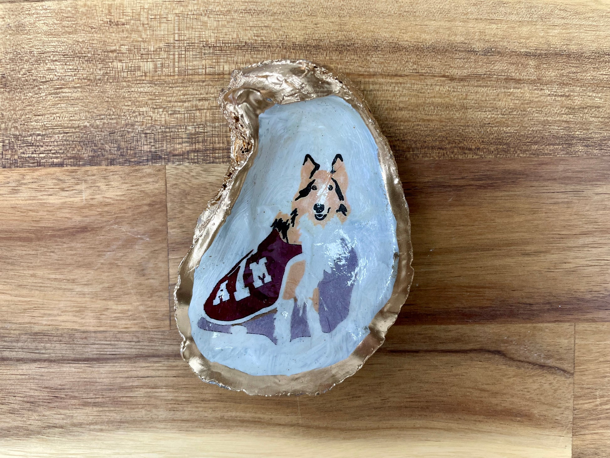 Oyster shells harvested from Rockport, Texas are decoupaged and hand painted with gold trim for a beautiful ring dish to show your school spirit!