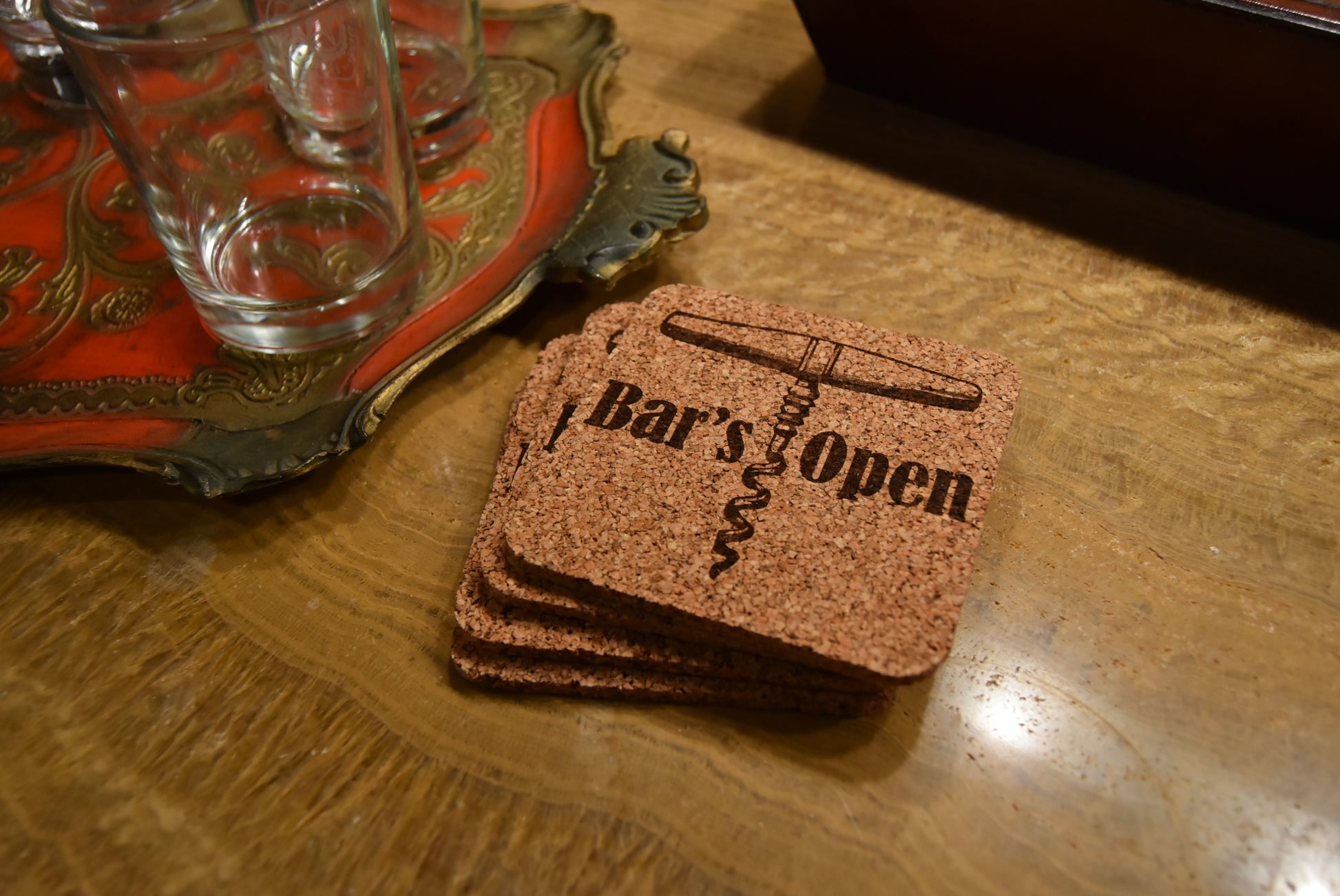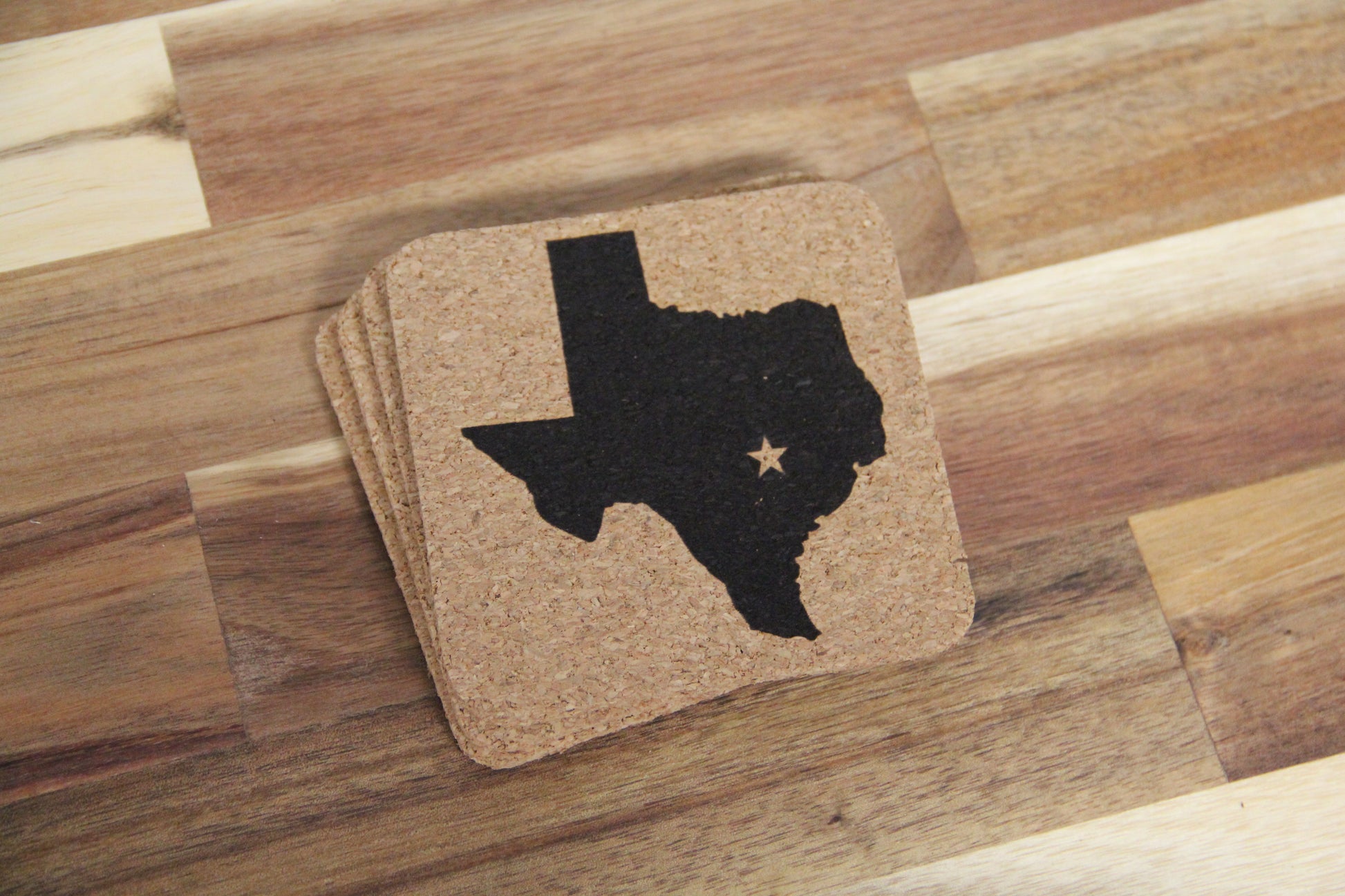 Product Details: Cork coasters cut on the hydraulic press and laser etched with ready made design.