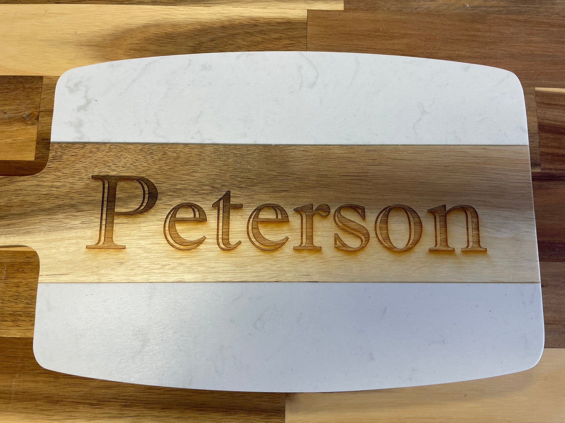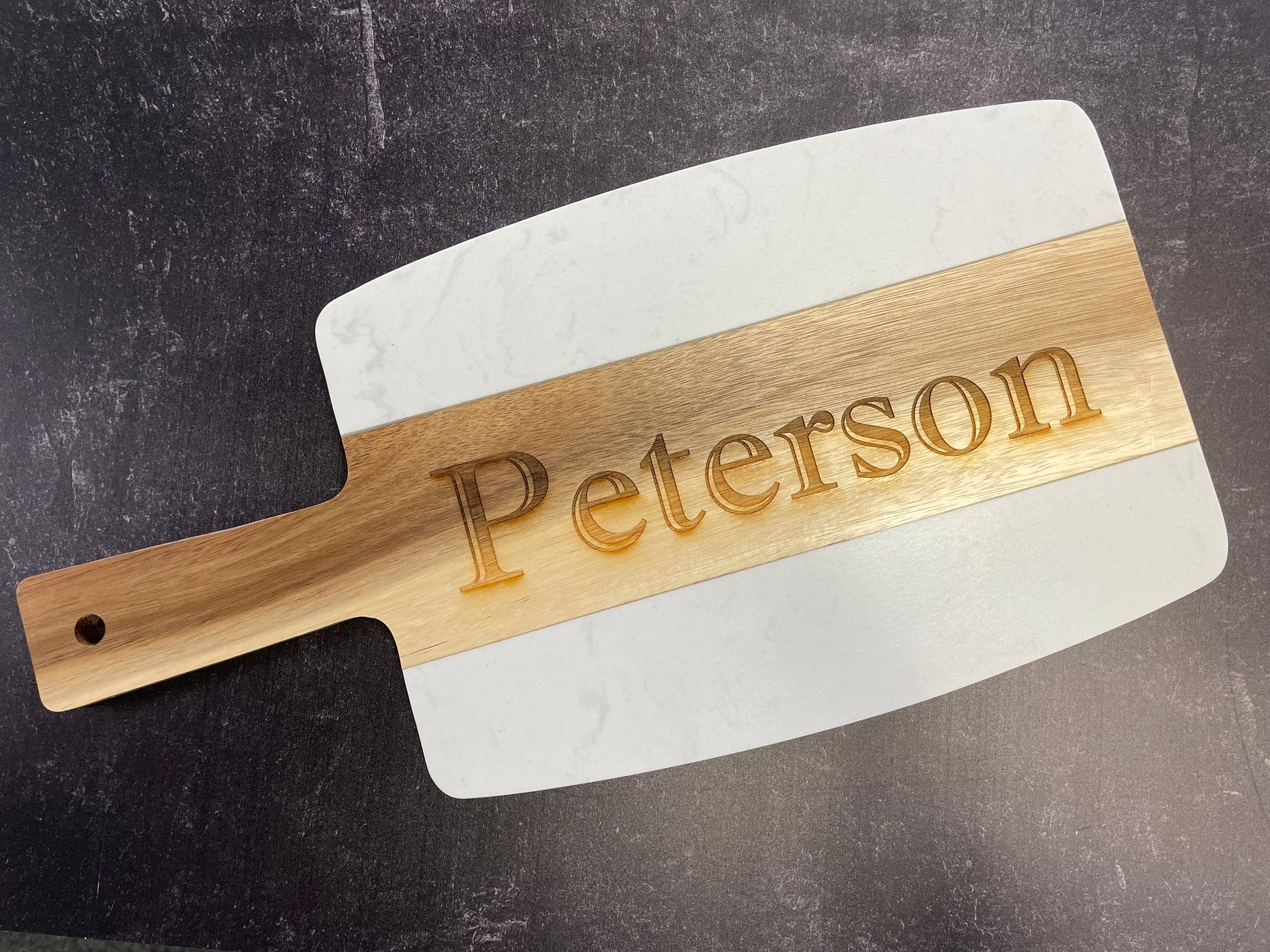 Beautiful marble and wood cutting board. May be personalized with a name or initials. Measures 10.5" x 7.5" with a 4.5" handle.