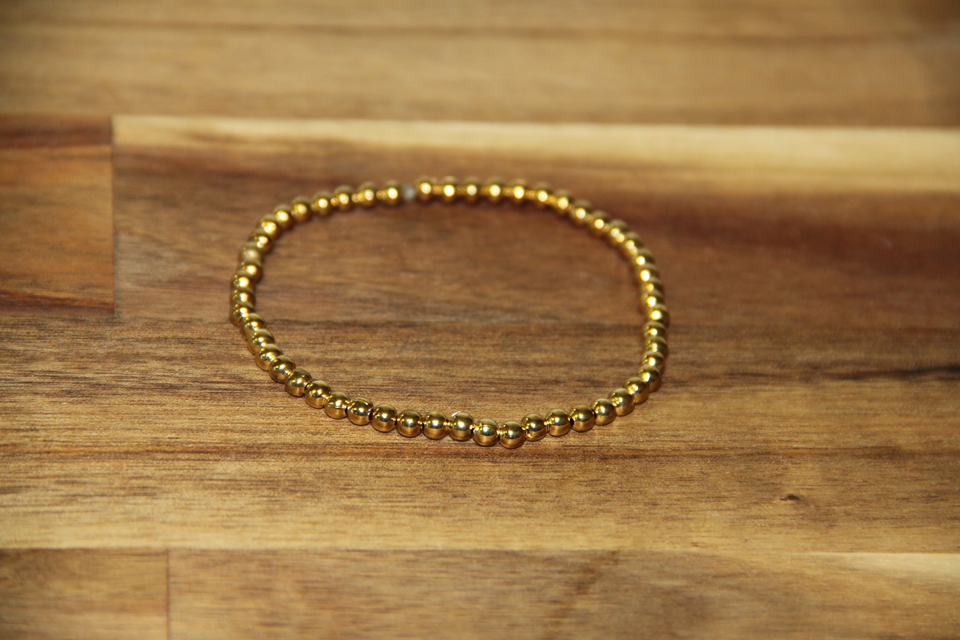 Product Details: Hand beaded, gold colored bracelet on elastic. Great for stacking!