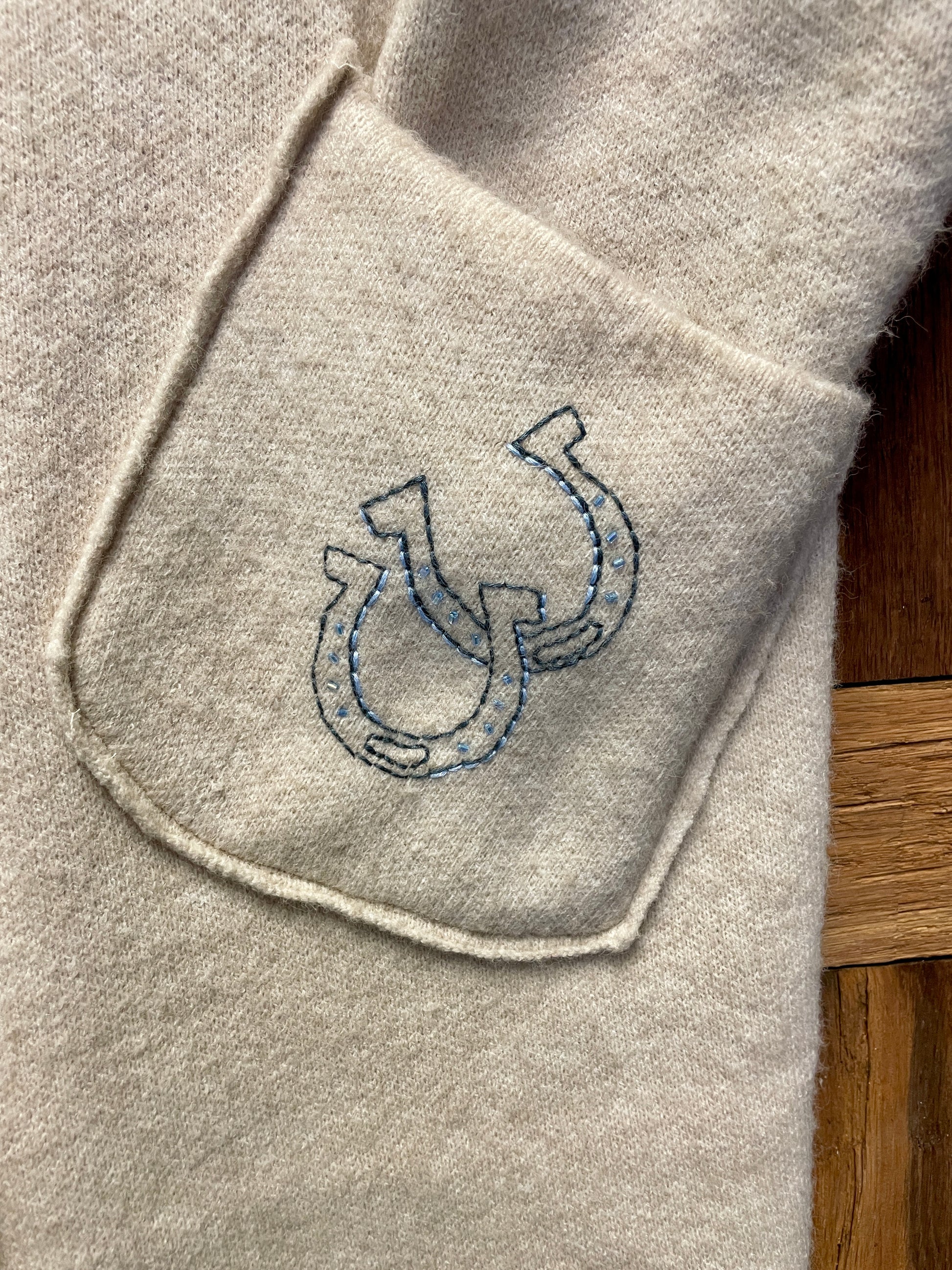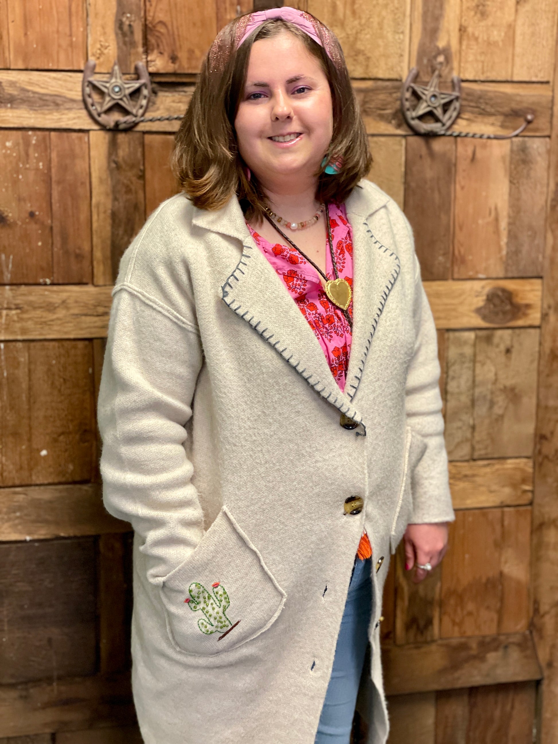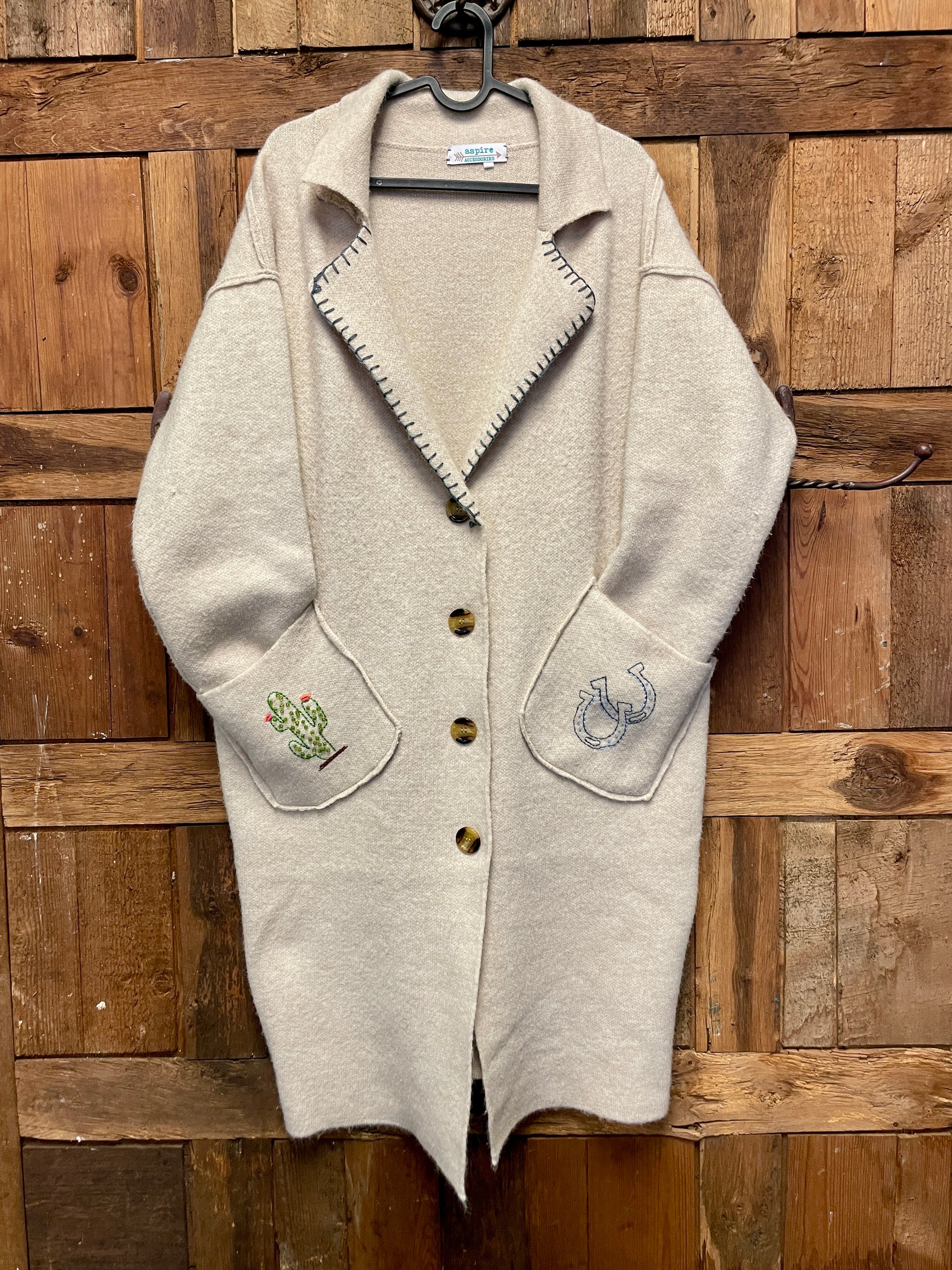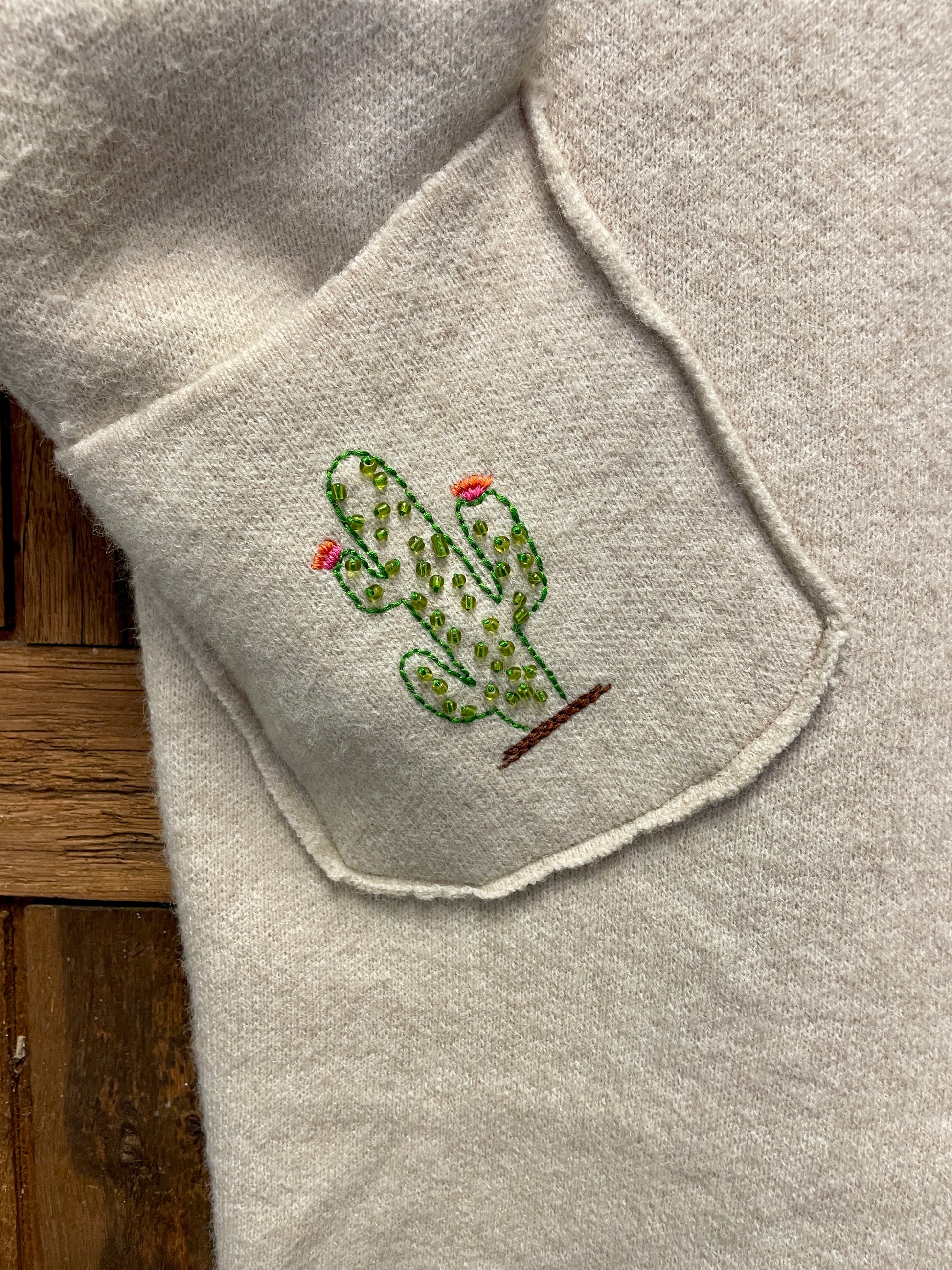 Wrap yourself up in this cozy cardigan hand embroidered by the Aspire artisans. The oatmeal color is seasonless! Details include blanket stitch around the collar, hand embroidered and beaded details on the pockets with cactus and horseshoe images. The perfect piece for rodeo and more!