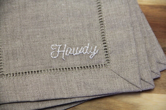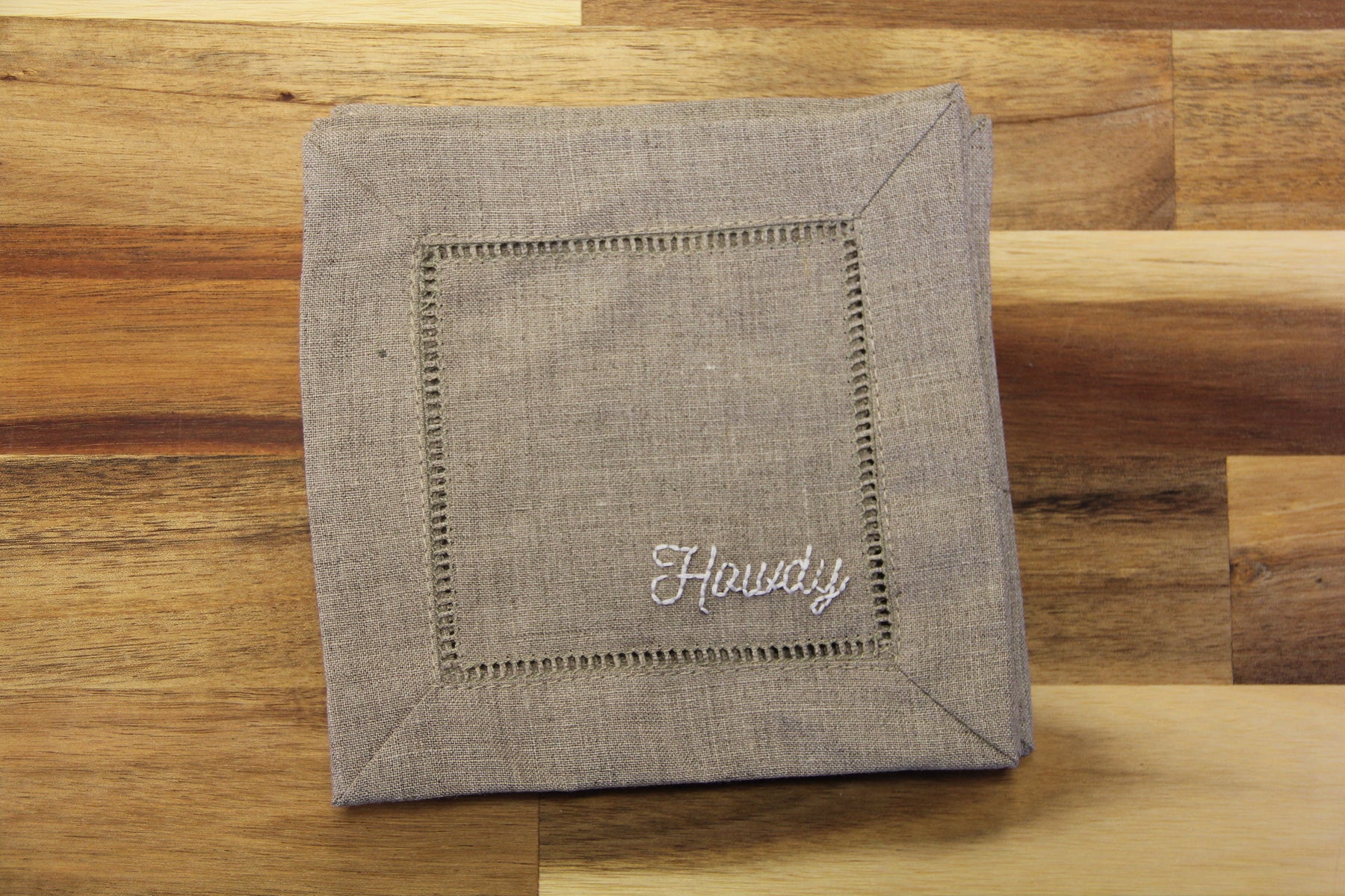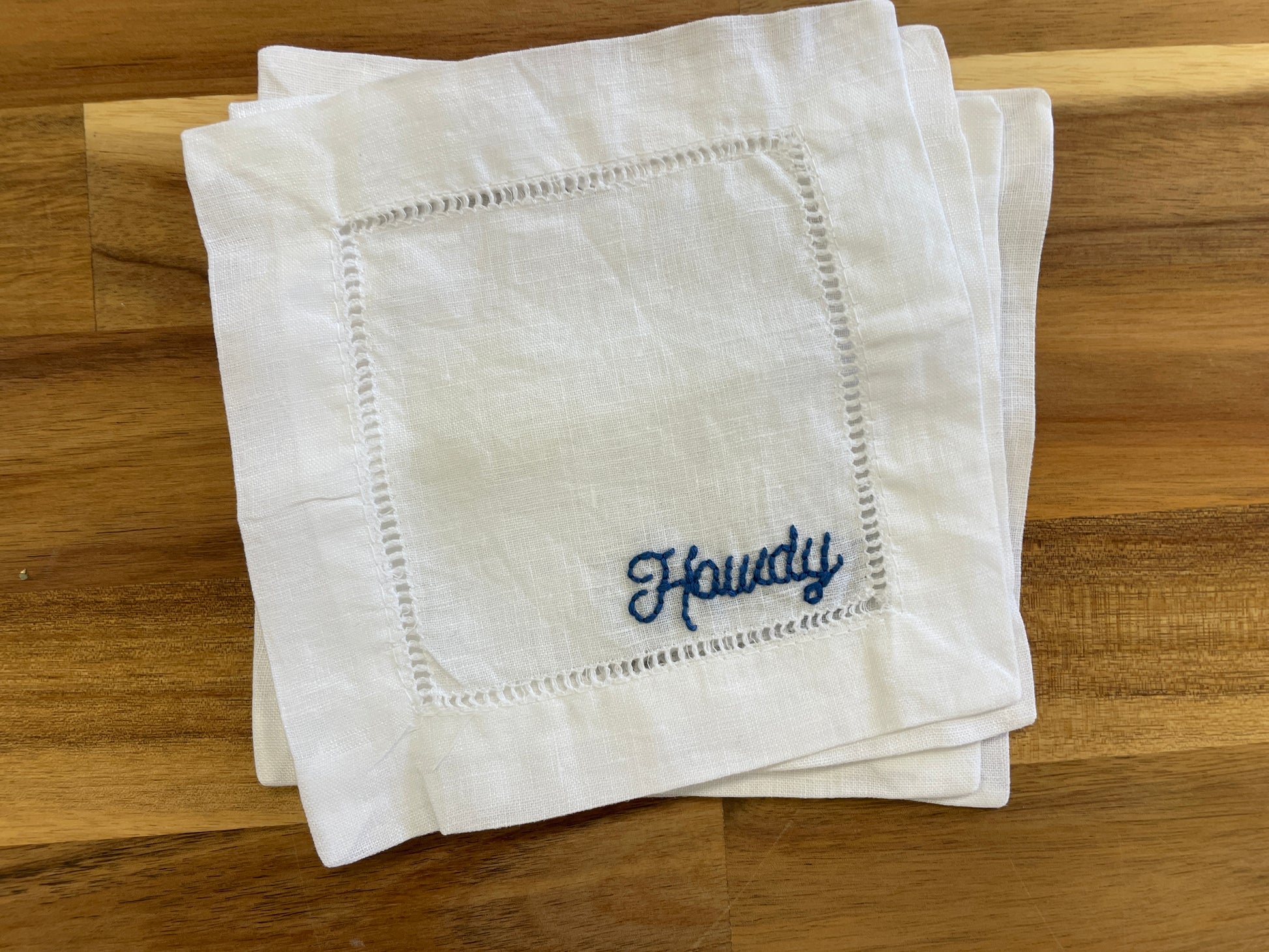 Product Details: Set of 4 linen, hand embroidered cocktail napkins. Each napkin measures 6"x6".