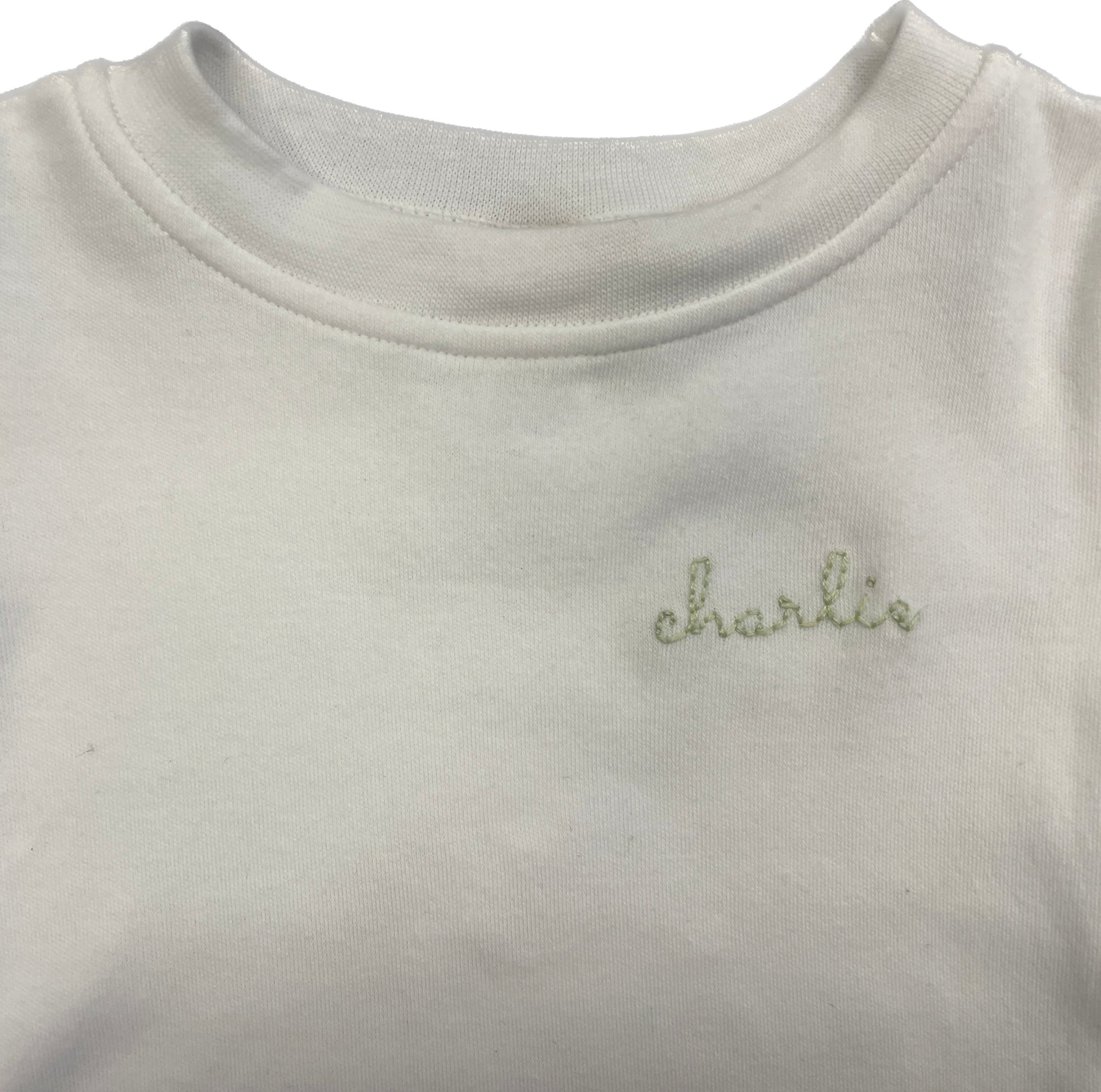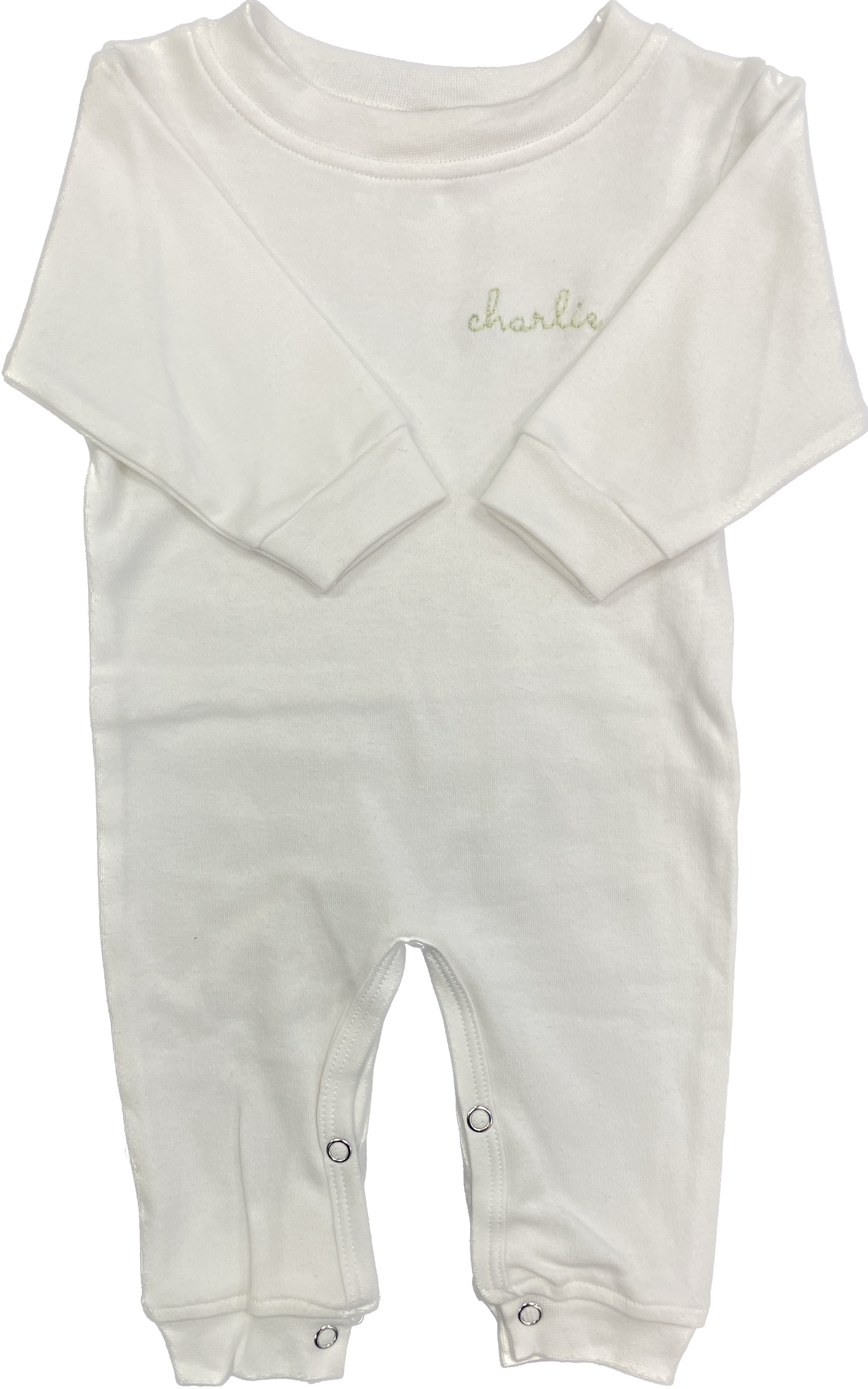 Long sleeve white unisex sleep and play outfit. 100% cotton ultra-breathable fabric. The name is hand-embroidered by the Aspire artisans.