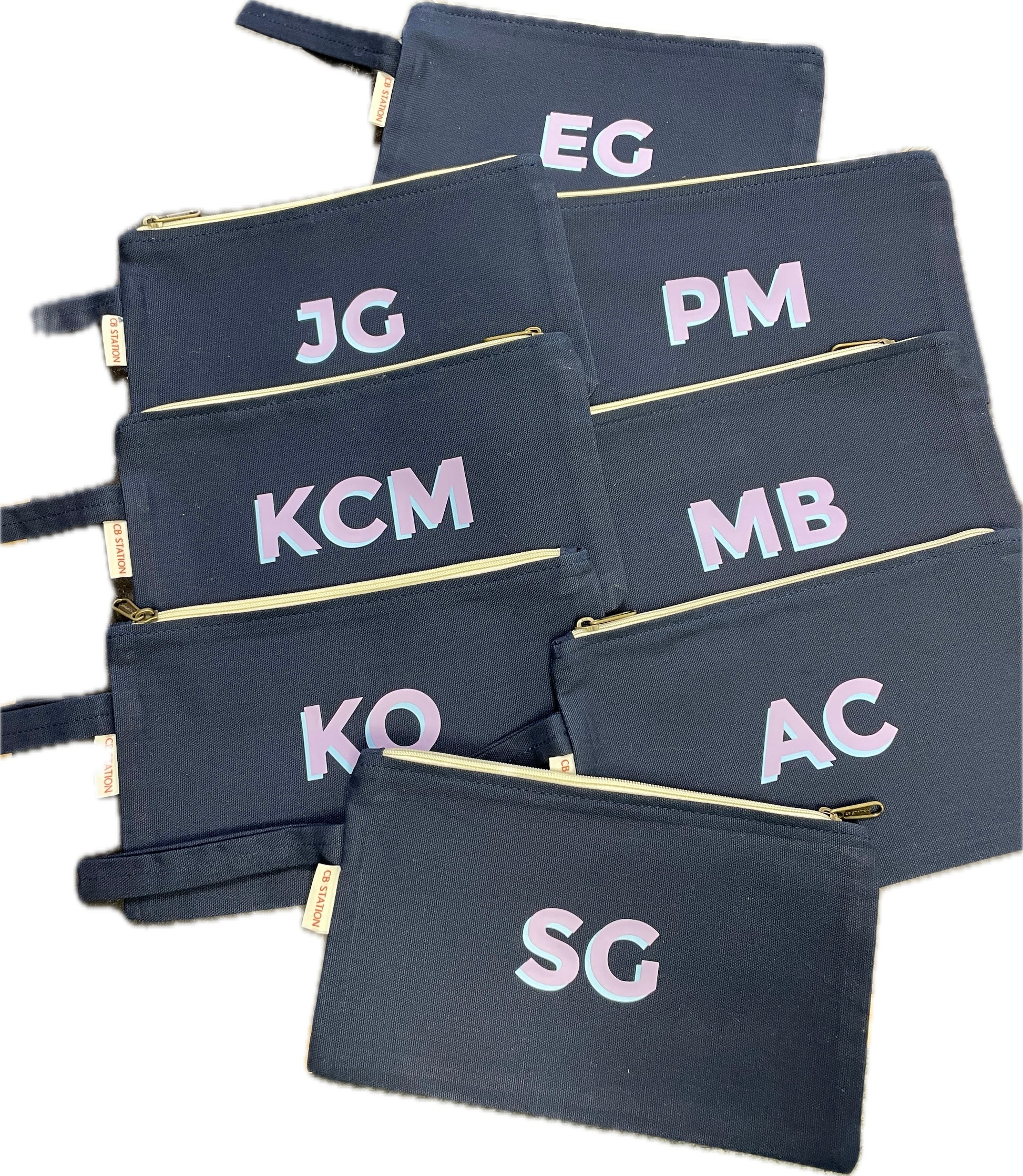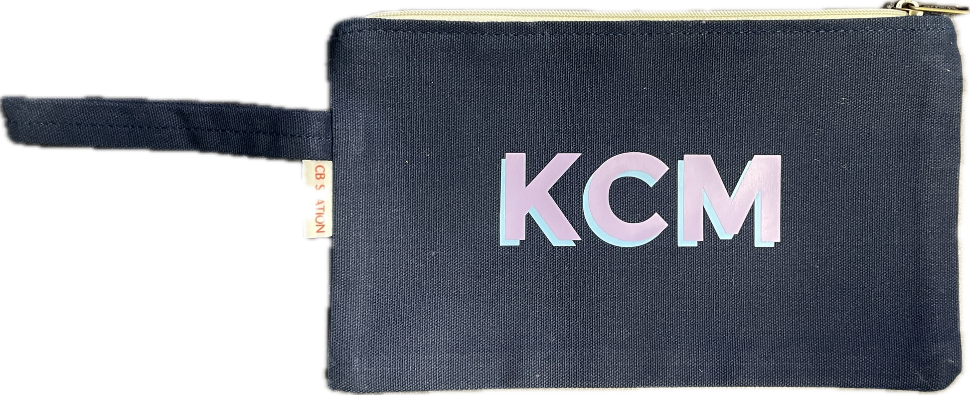 This charming little navy pouch is the perfect bag for toiletries or cosmetics. Monogram done in vinyl lettering with your choice of colors. Letter coloring displayed here: purple with light blue shadow.