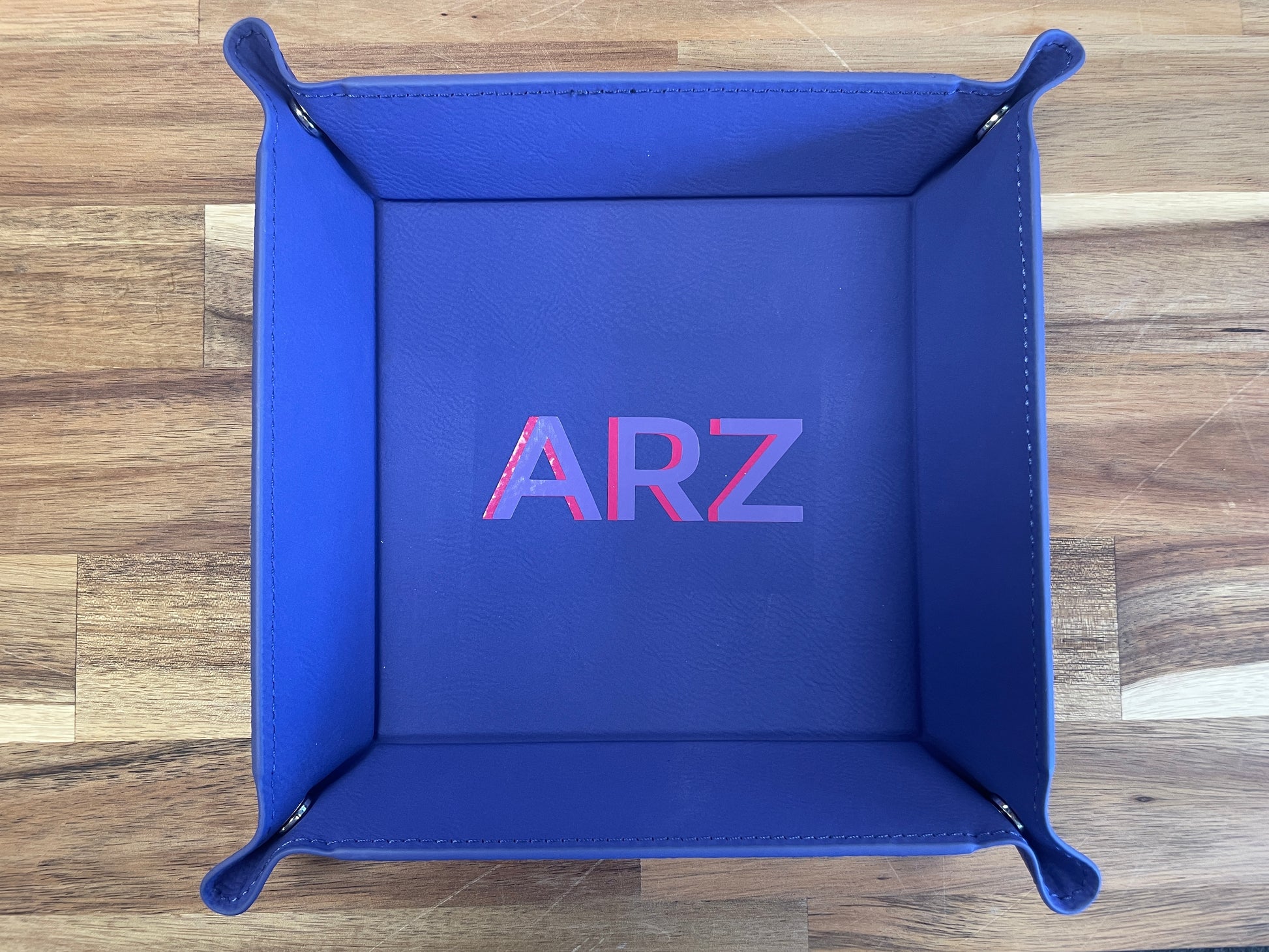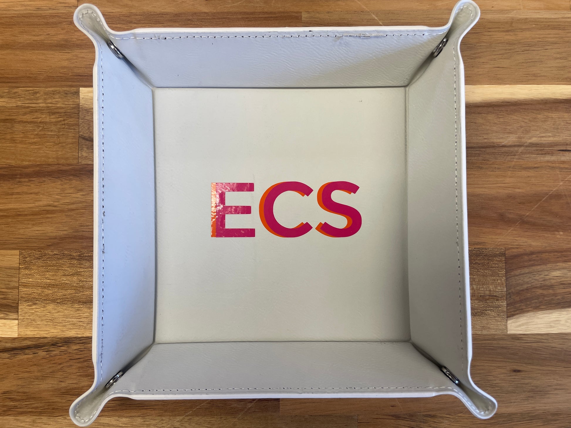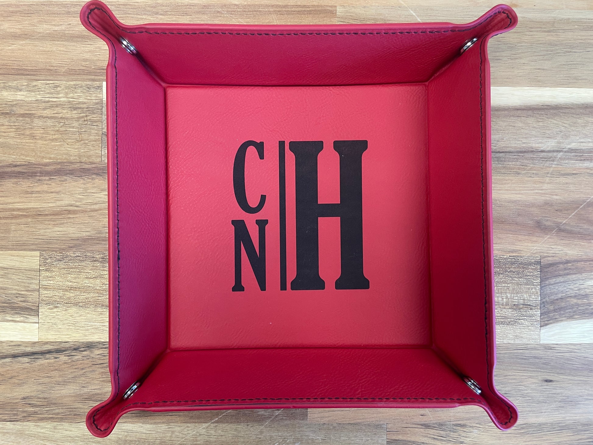 Hand-crafted monogrammed catch-all in vegan leather. Available in 5 colors. Monogram can be done in vinyl lettering with your choice of colors or laser printed (font will appear black as on red model shown here).