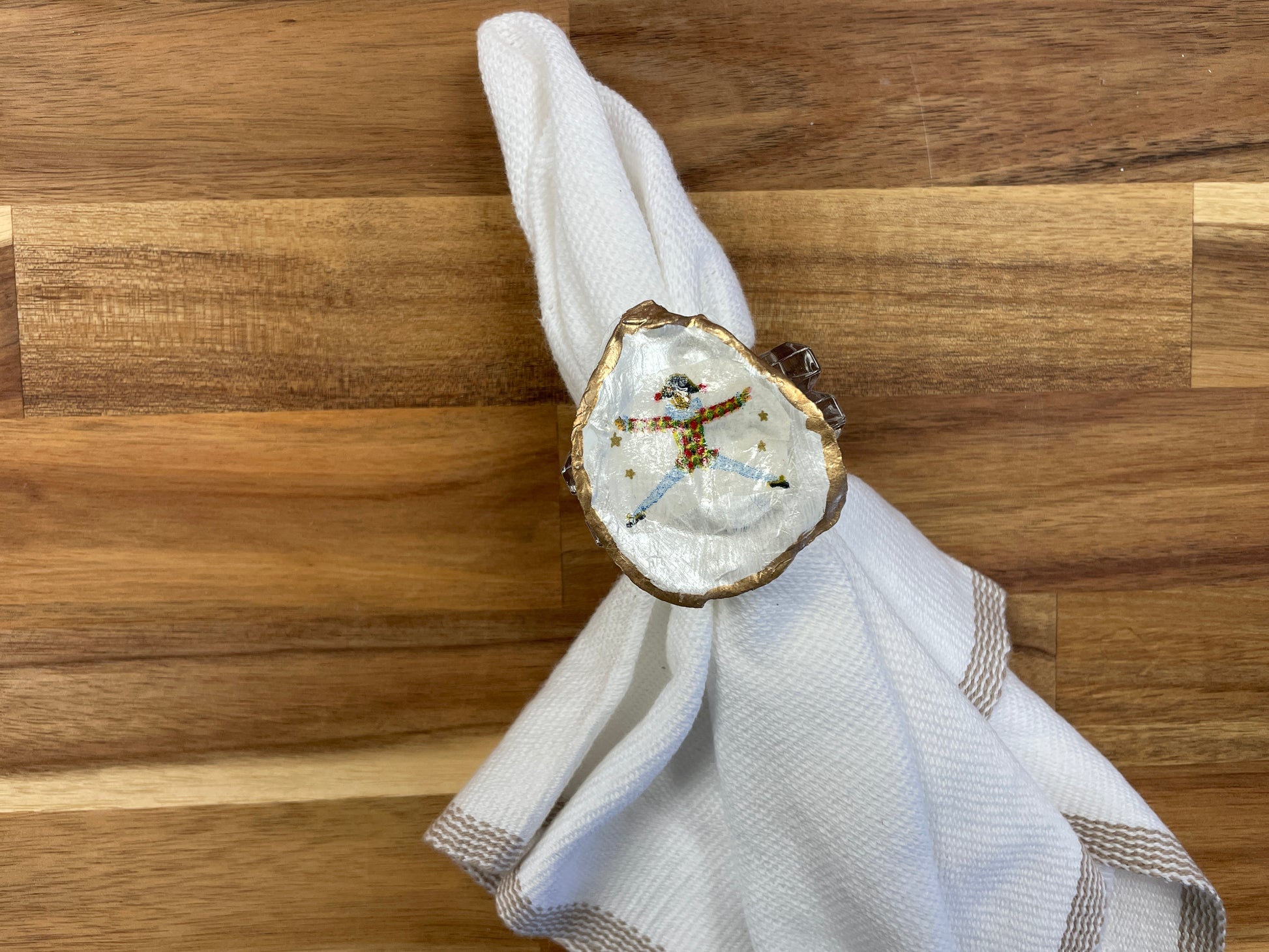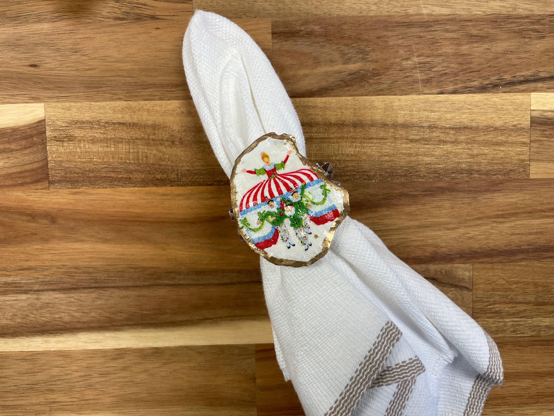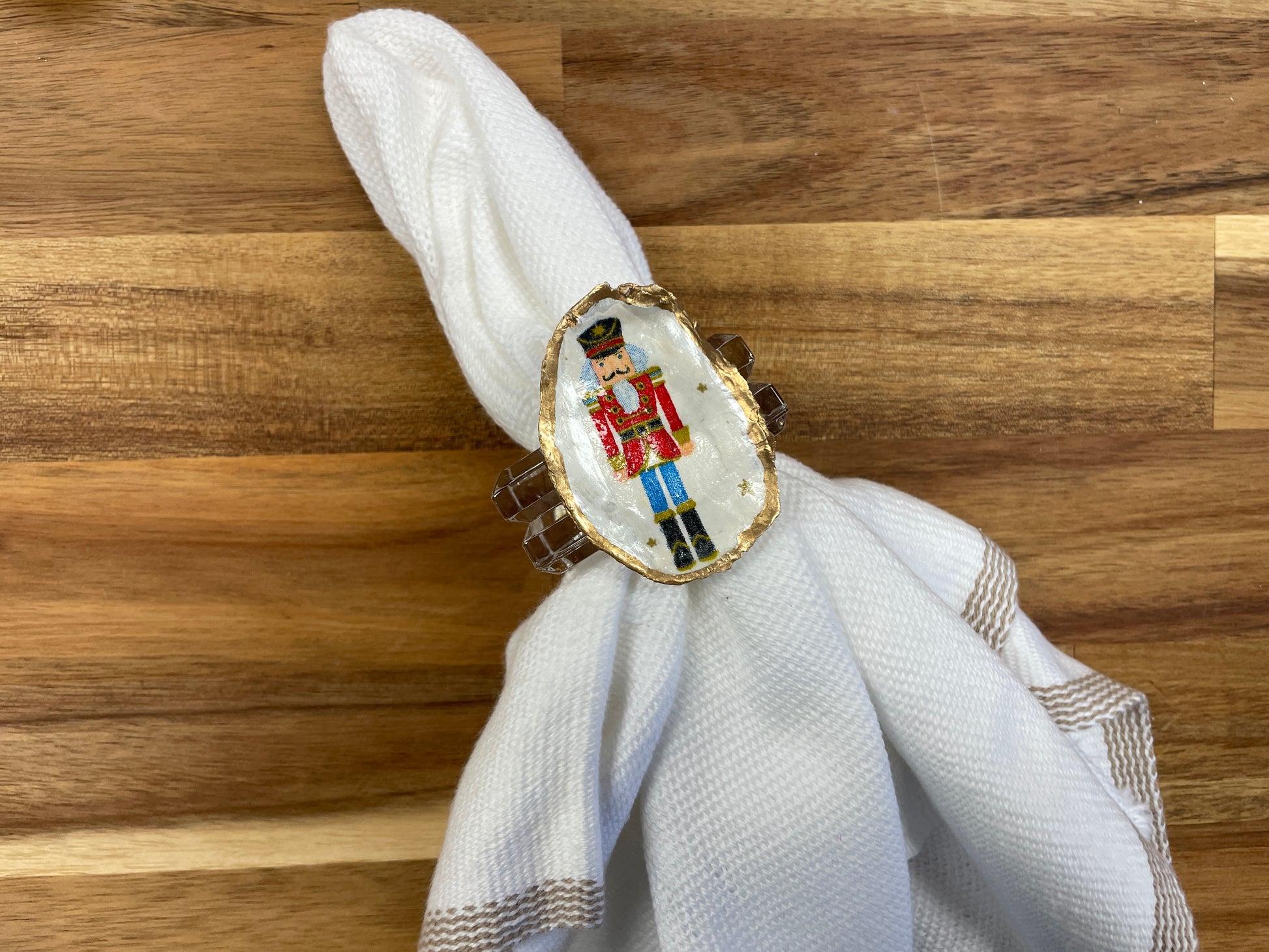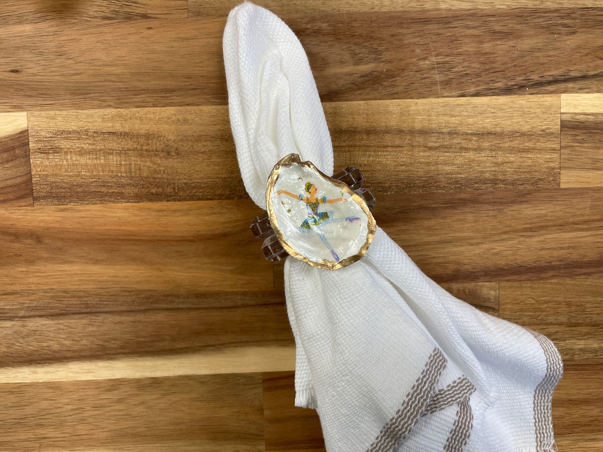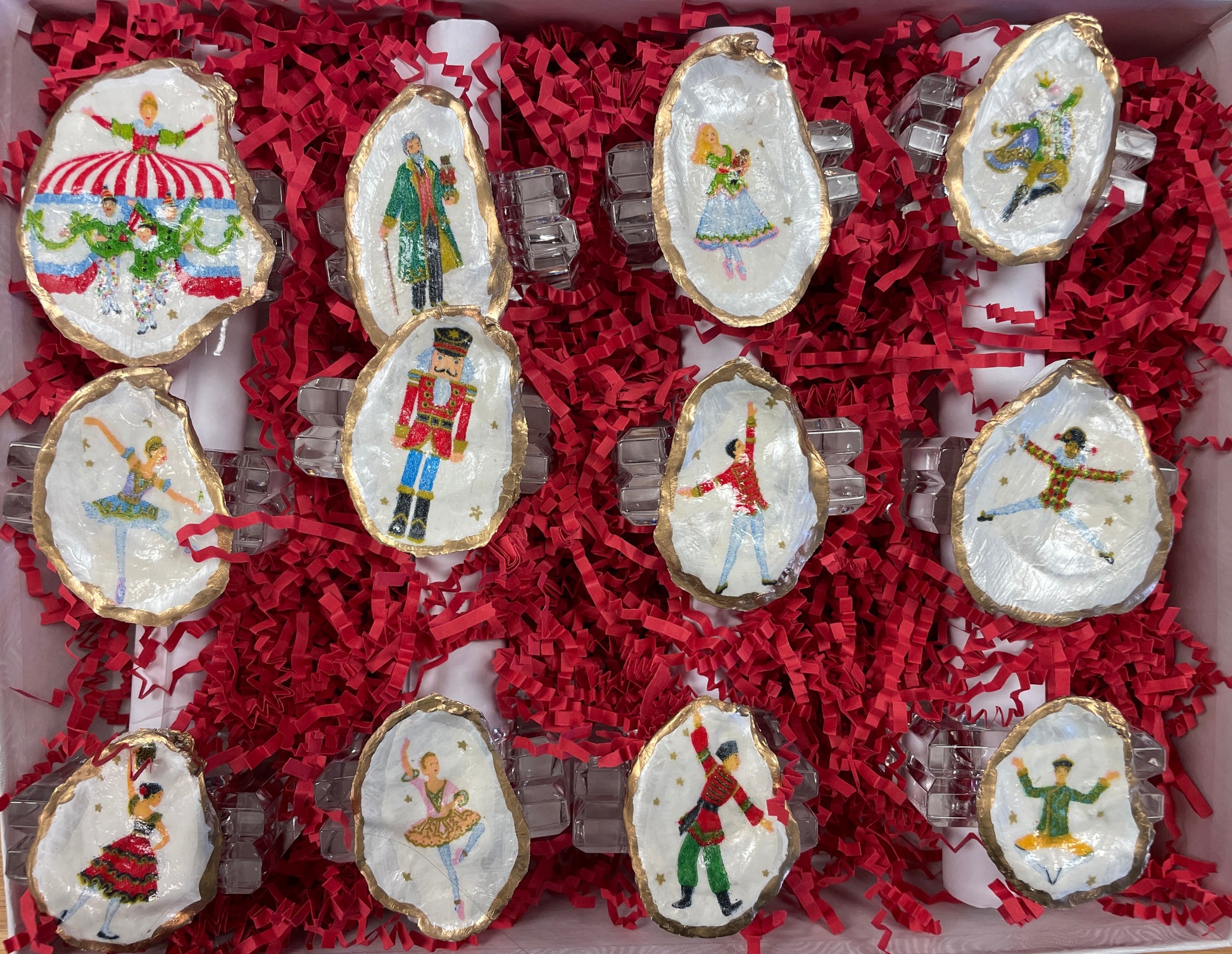 Product Detail: Beautiful set of 12 oyster shells decoupaged and painted with the characters from The Nutcracker that sit on an acrylic napkin ring. The shells are picked in Rockport, Texas where the group attends camp every summer. Each shell is unique in its size and shape. These are the perfect additions to your Christmas place setting!