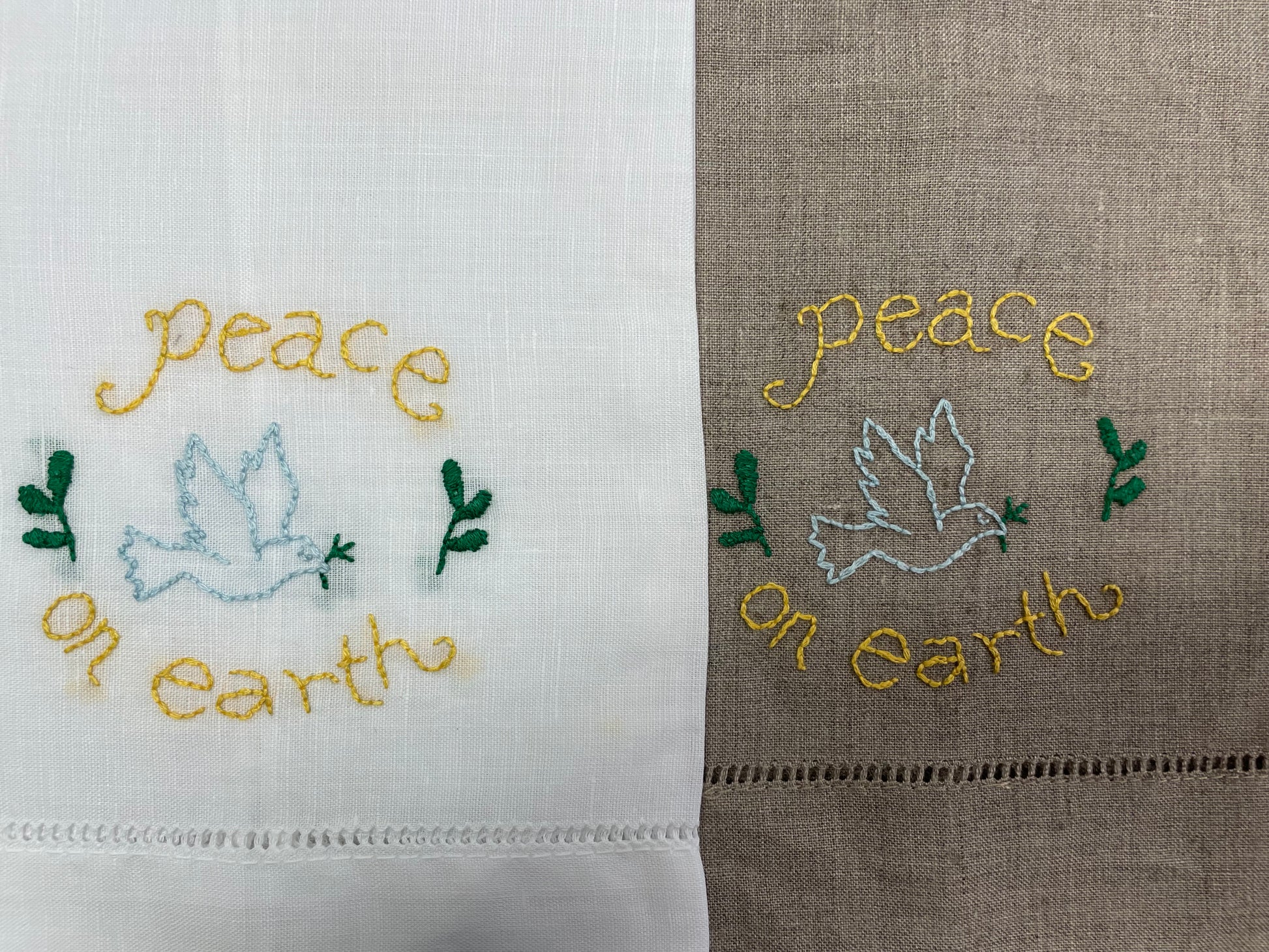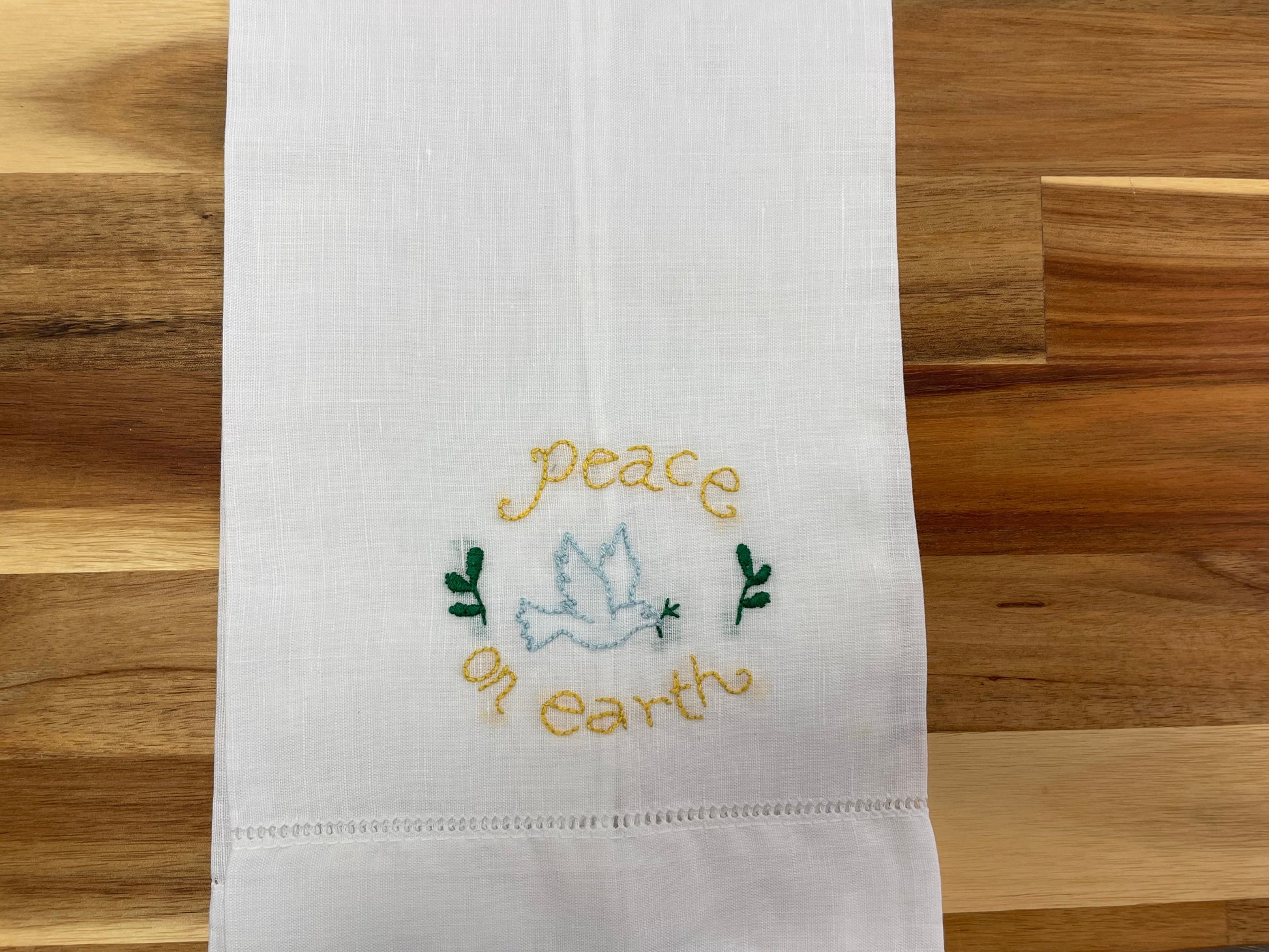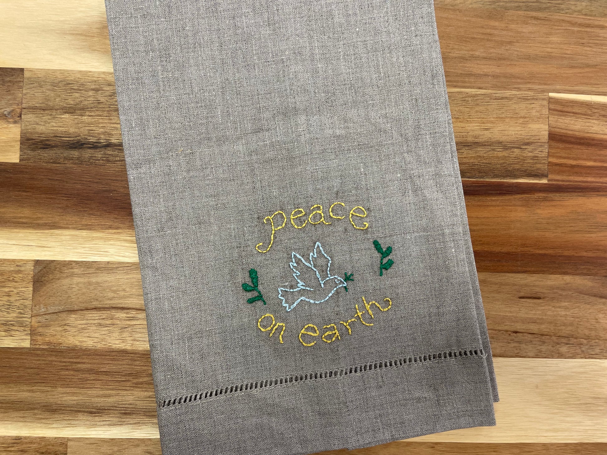 Product Details: Linen tea towel, hand embroidered by the artisans at Aspire.
