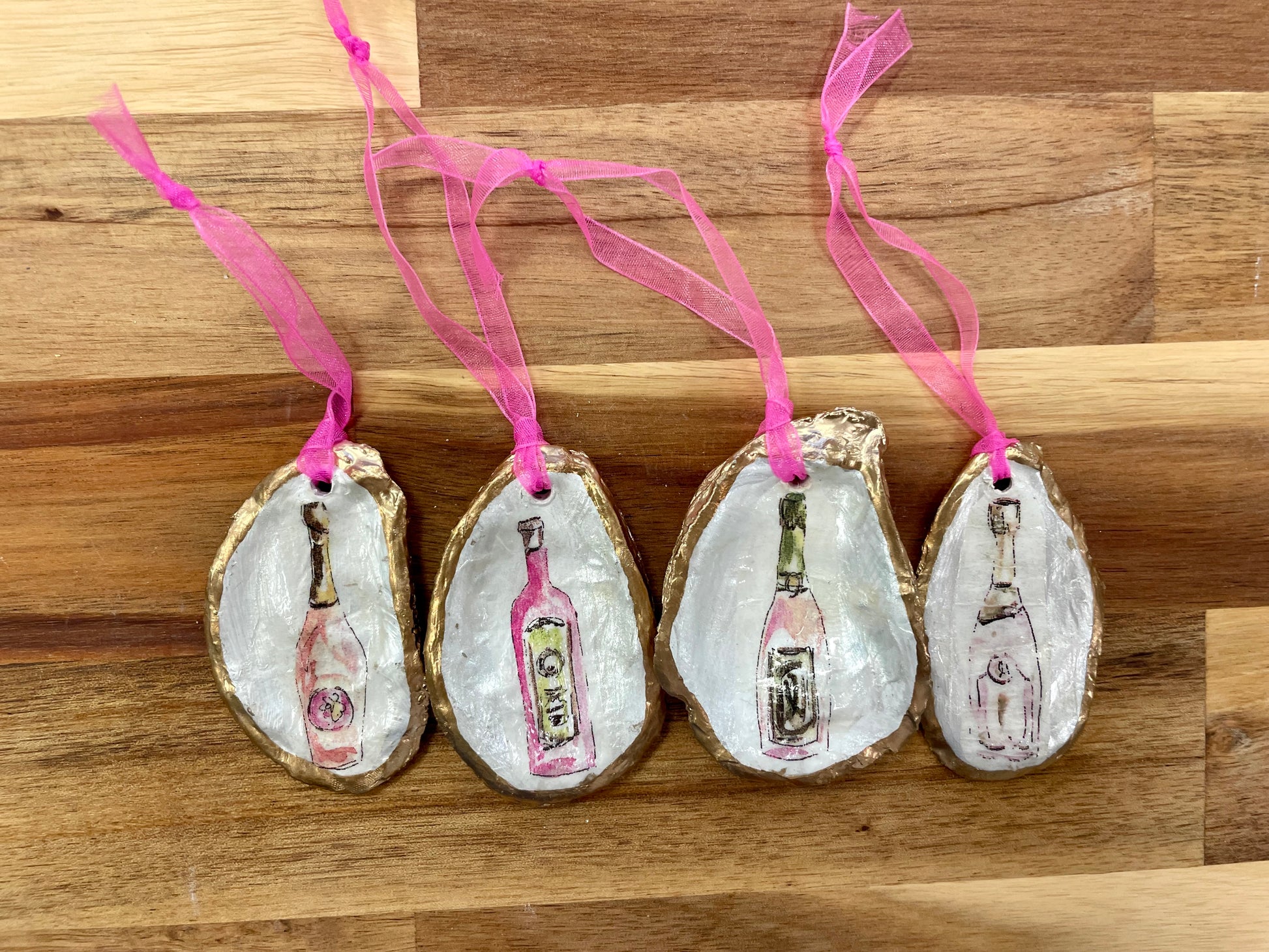 Set of four oyster shell ornaments decoupaged with festive bottles of bubbles! The shells are picked in Rockport, Texas where the artisans attend camp every summer. Each shell is unique in its size and shape and hangs from a coordinating ribbon.