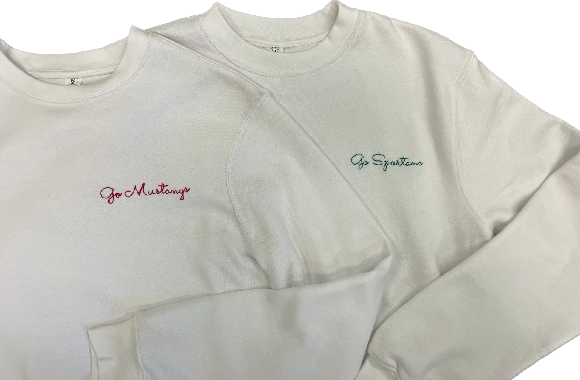 Hand embroidered sweatshirt celebrating your favorite high school! Sweatshirts are available in white and embroidered in the coordinating school color.