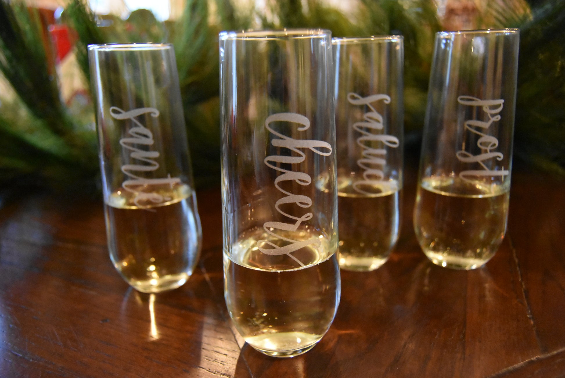 8.5 oz laser engraved, stemless champagne flutes: 1 x Cheers, 1 x Sante, 1 x Salud, 1 x Prost