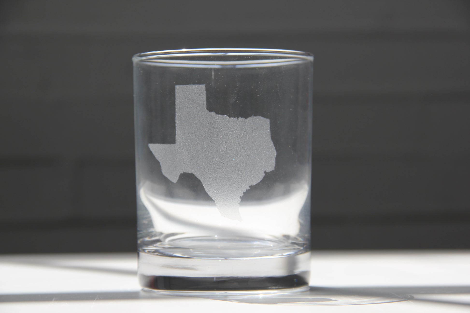 Product Details: Laser etched "Texas" state lowball glasses.