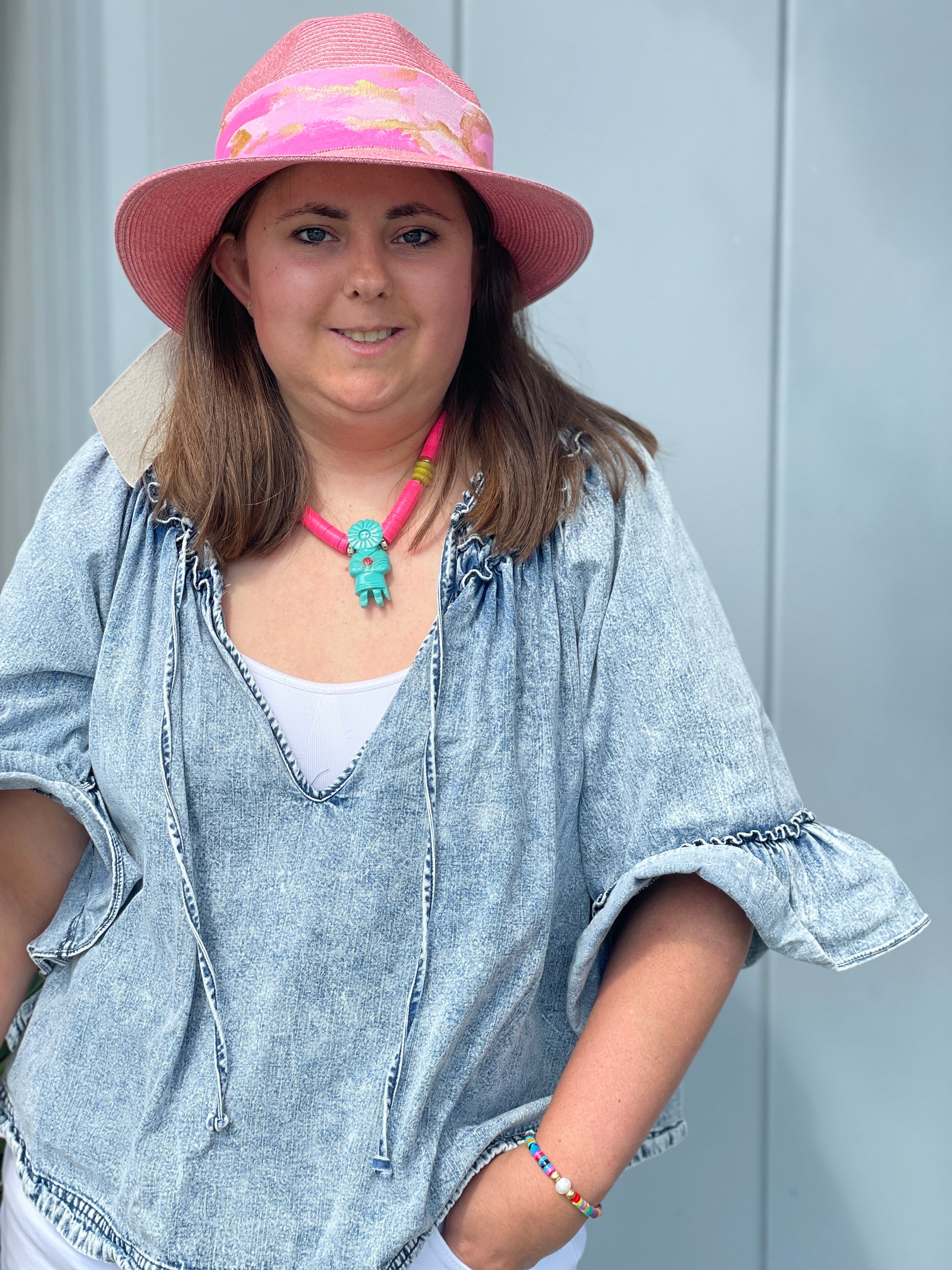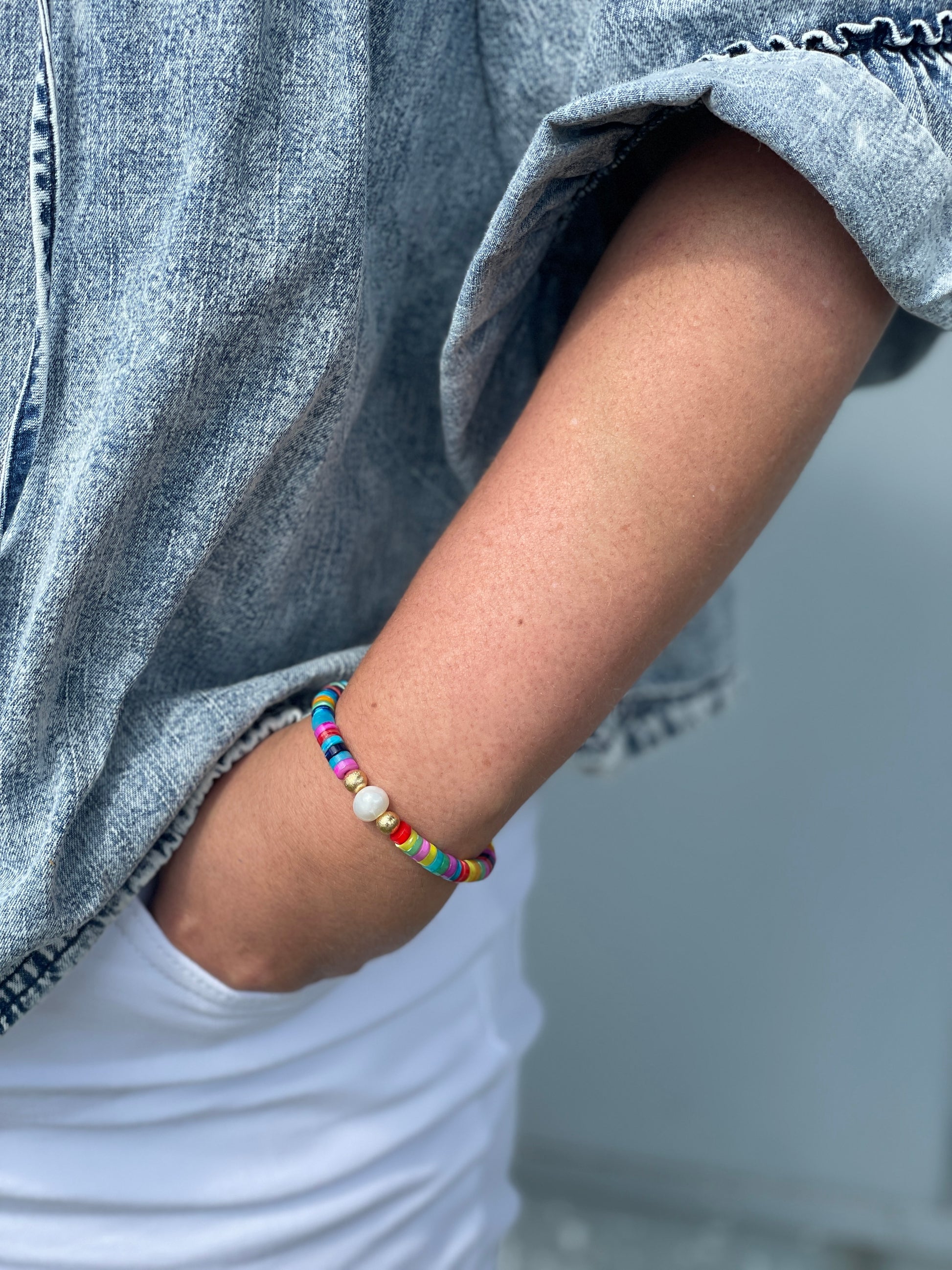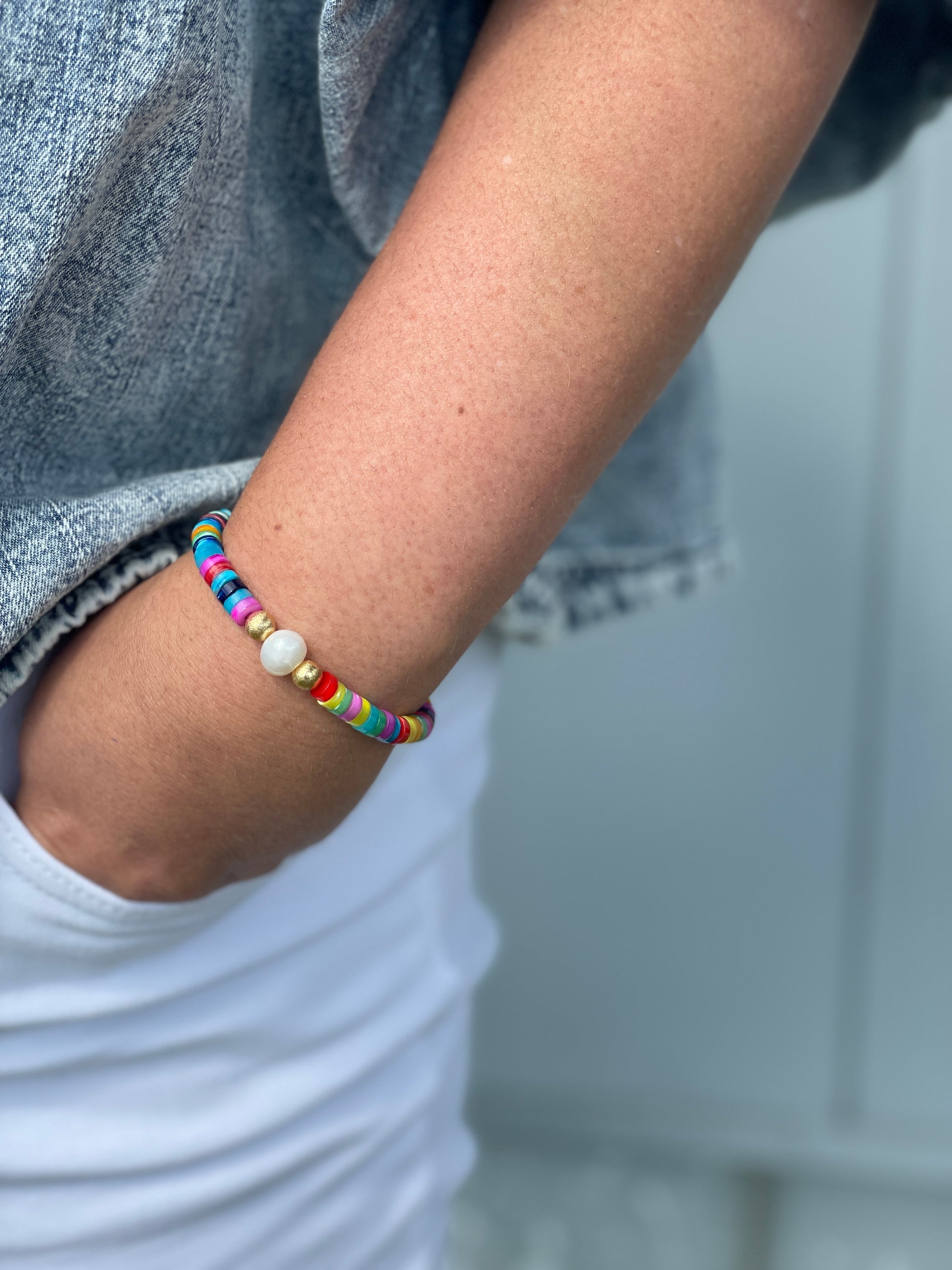 This Val Bracelet is crafted with beautiful mother of pearl multicolored heishi beads, gold filled beads, and mother of pearl for a luxurious look. The stretchy bracelet makes it perfect for stacking with other bracelets, for a unique personalized touch.