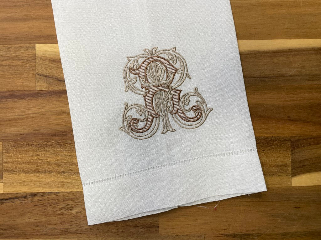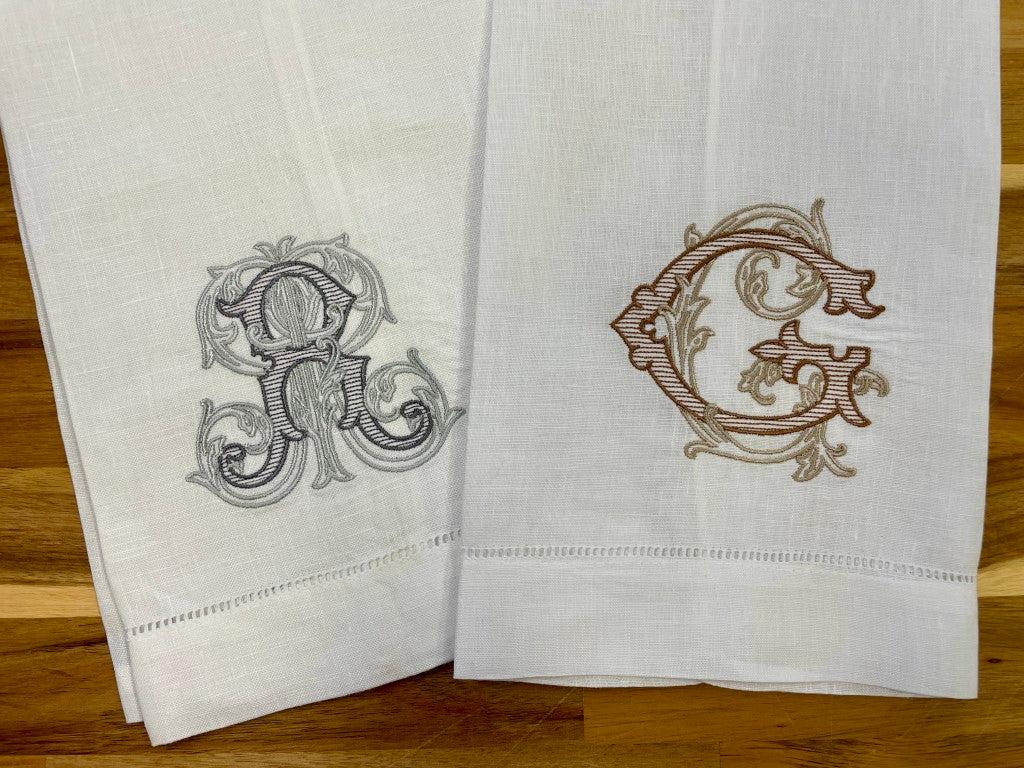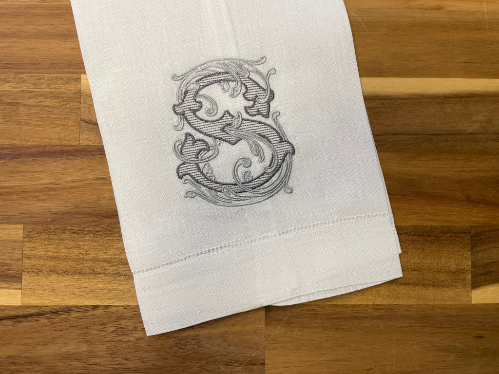 Add a touch of timeless sophistication to your kitchen or guest bathroom with this beautifully embroidered tea towel. Crafted from high-quality, crisp white linen, this towel features an ornate, vintage-inspired monogram. The intricate embroidery showcases the threadwork, bringing an elegant, refined charm to your home décor.